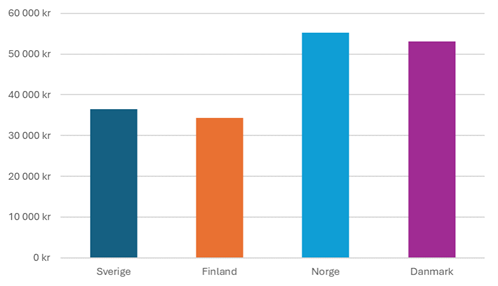 - Nordiska löneskillnader. 2022 var genomsnittliga löneskillnaden före skatt omkring 50 procent jämfört med både Norge och Danmark. I Norge och Danmark fick en civilingenjör ungefär 200 000 kronor mer än i Sverige – per år, efter skatt.