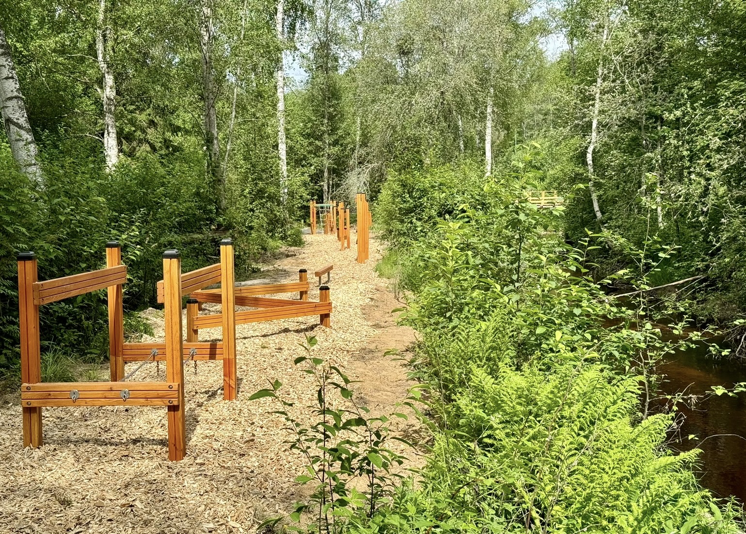 Just nu pågår de sista detaljerna för att färdigställa den 30 meter långa hinderbanan som omges av träflis för att skapa ett mjukt underlag. Längs slingan byggs även en ny bro som tar dig över Lillån som löper genom den natursköna miljön. Bron är placerad för att smälta in i omgivningen och bjuder på en charmig passage längs Björnbusarnas Naturstig. Här kommer det även att finnas en sträcka för den badsugna att vada över ån.