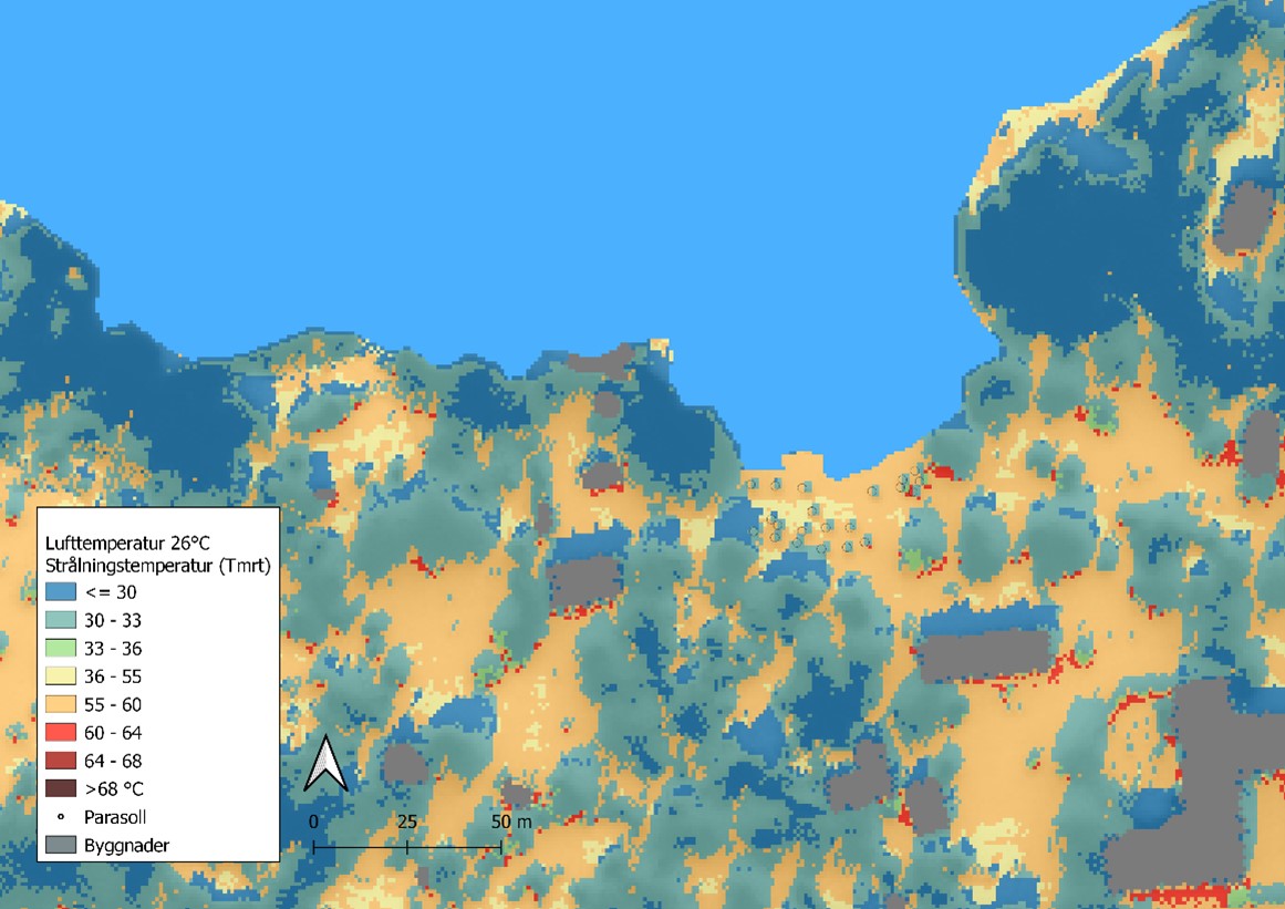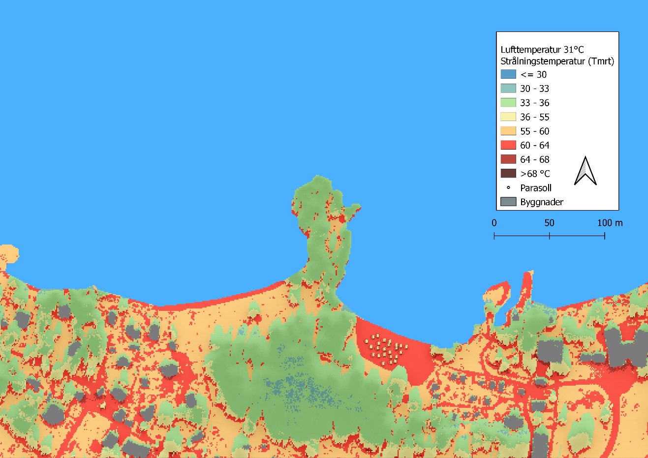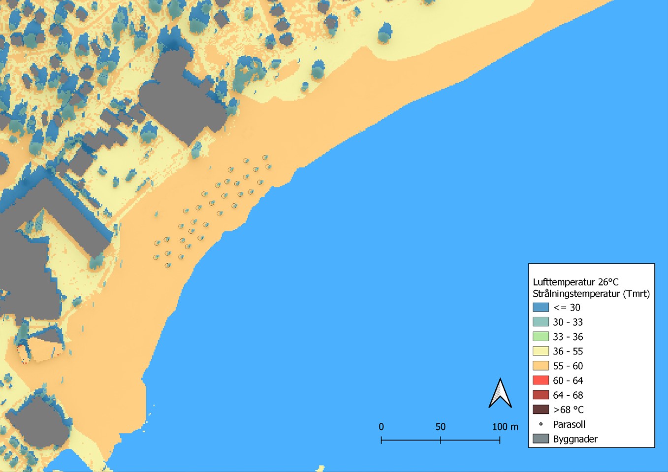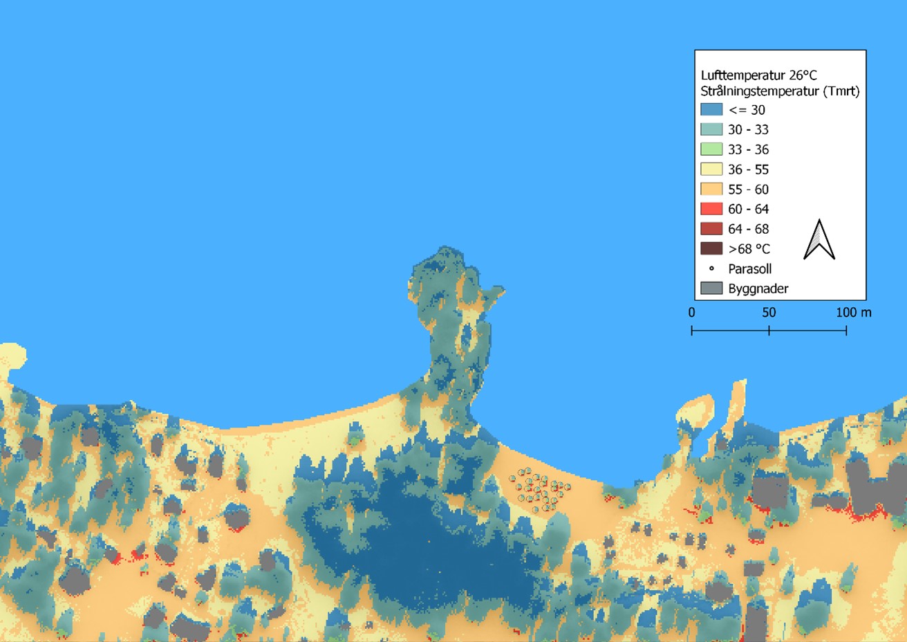 - När lufttemperaturen är 26 grader (°C) är delar av stränderna röda på kartbilderna med strålningstemperaturer på över 60 grader vilket innebär en höjd mortalitetsrisk på 10 procent för den nämnda målgruppen, och en höjd mortalitetsrisk på 5 procent även för människor mellan 45–79 år.