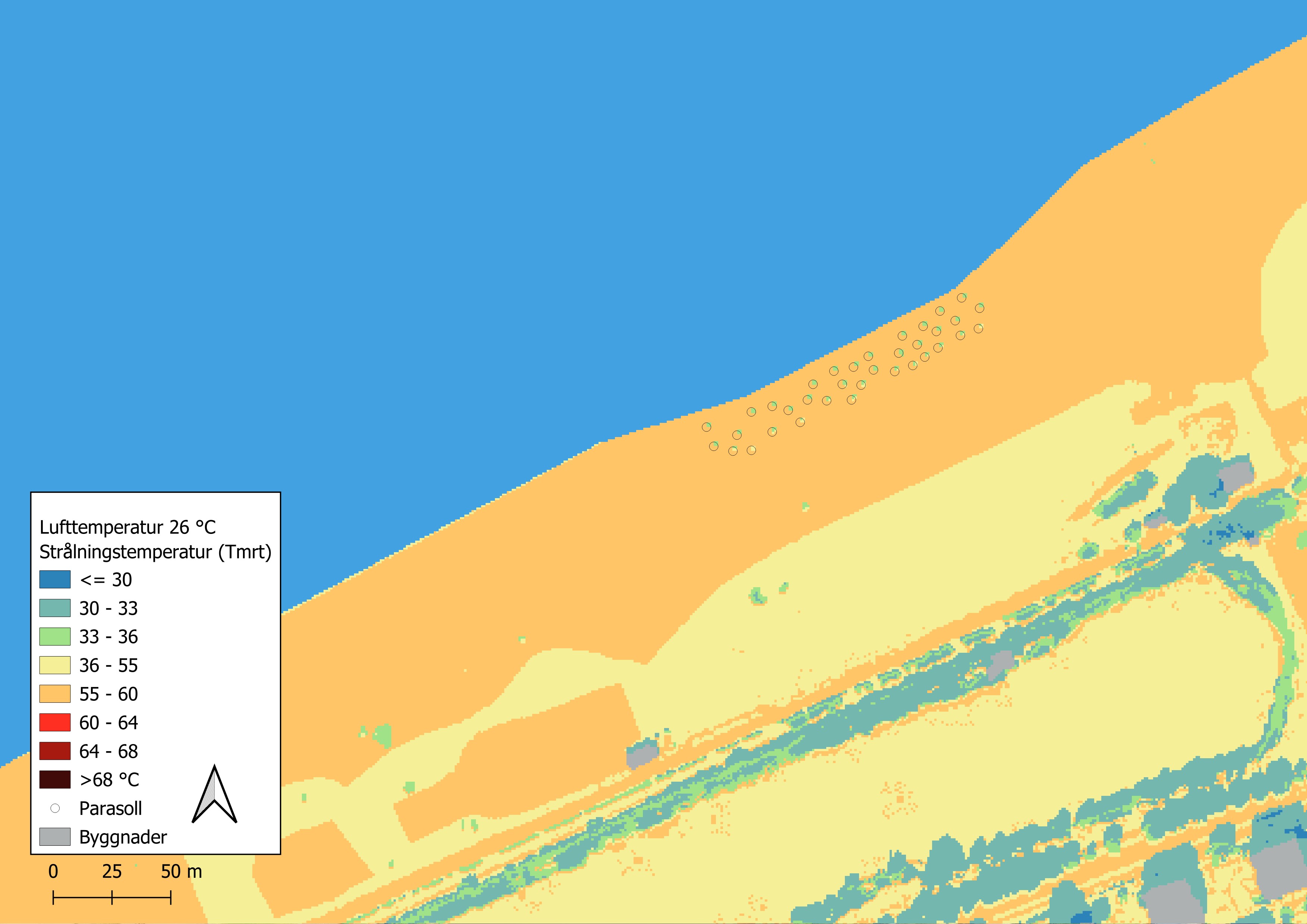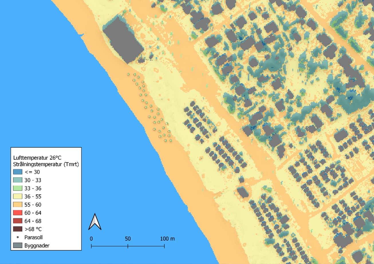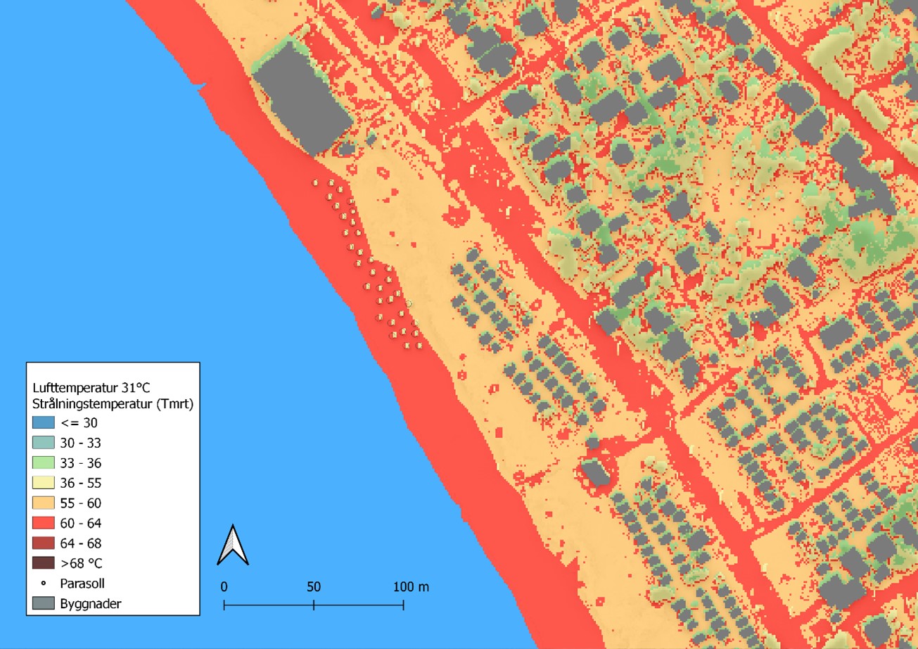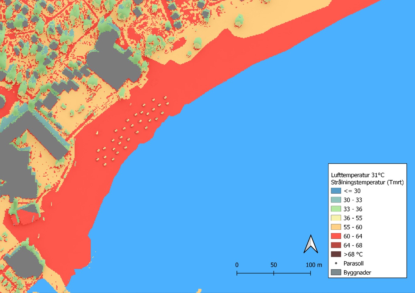 - När lufttemperaturen är 26 grader (°C) är delar av stränderna röda på kartbilderna med strålningstemperaturer på över 60 grader vilket innebär en höjd mortalitetsrisk på 10 procent för den nämnda målgruppen, och en höjd mortalitetsrisk på 5 procent även för människor mellan 45–79 år.