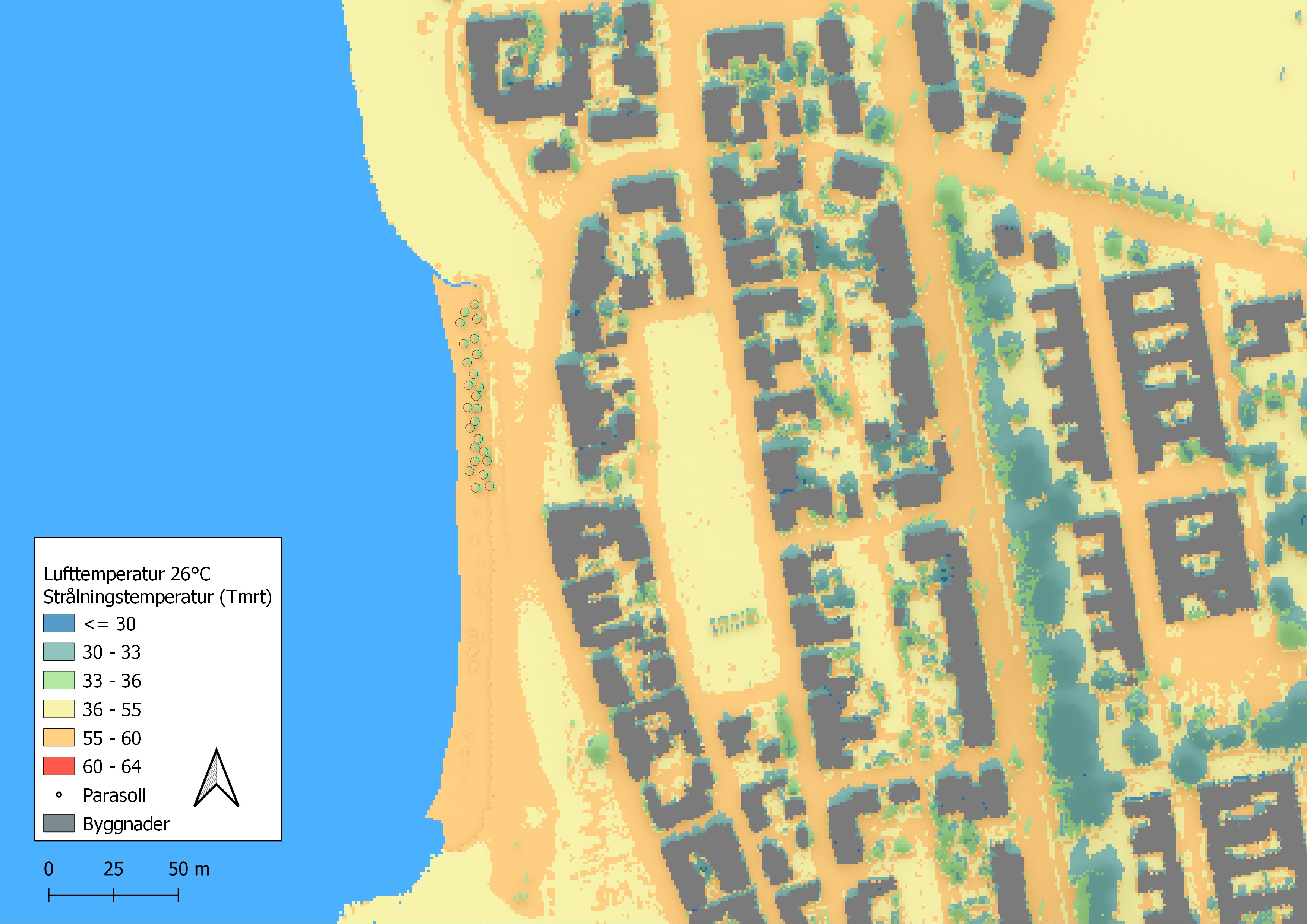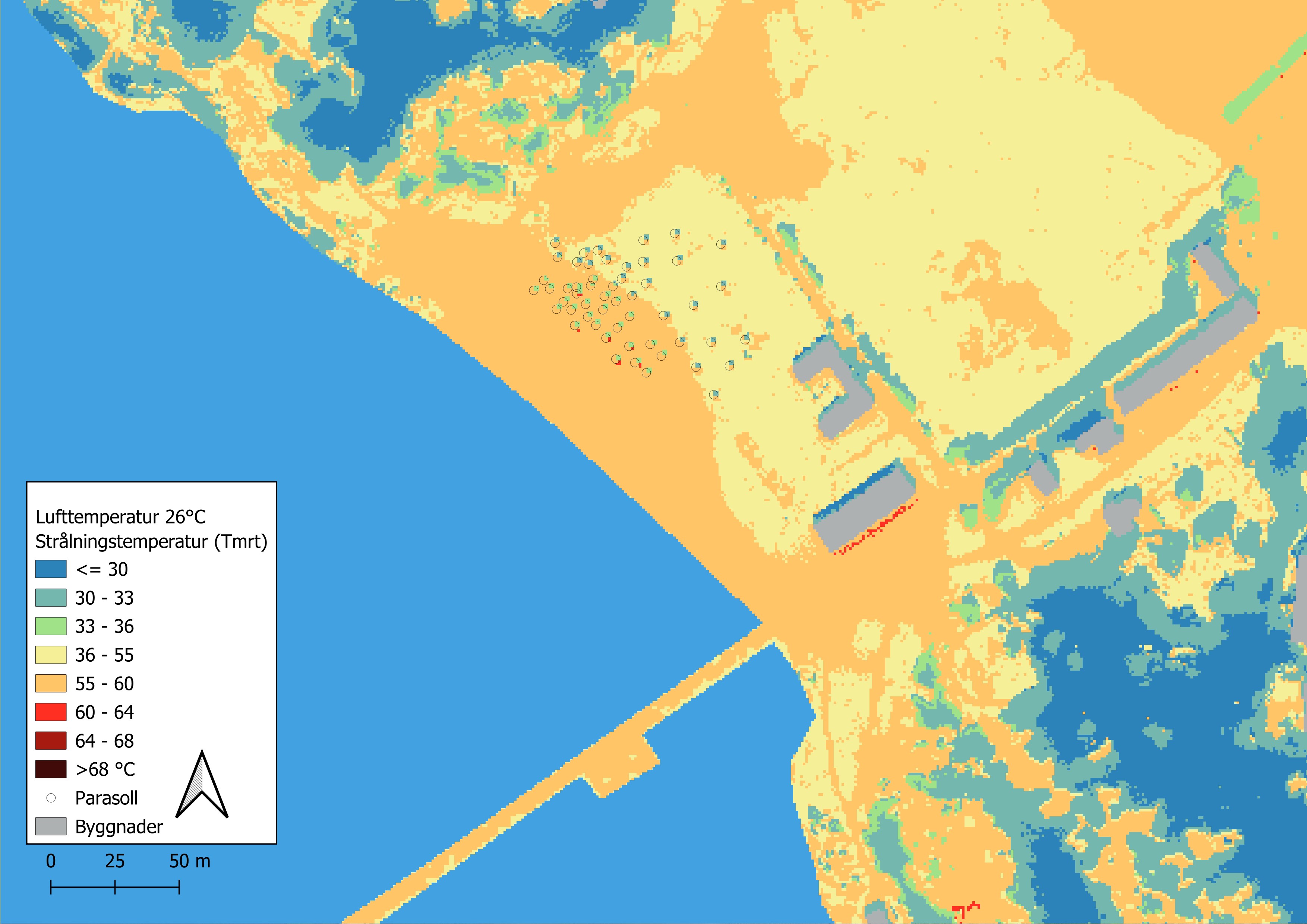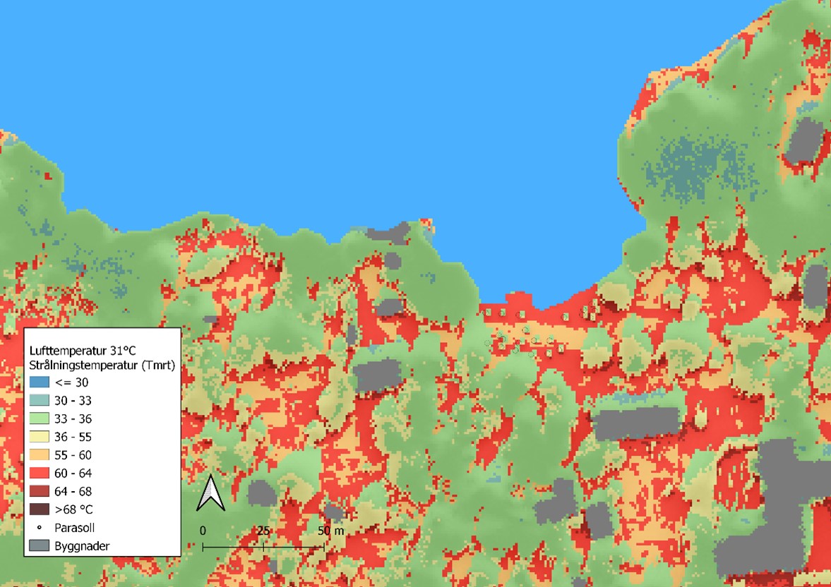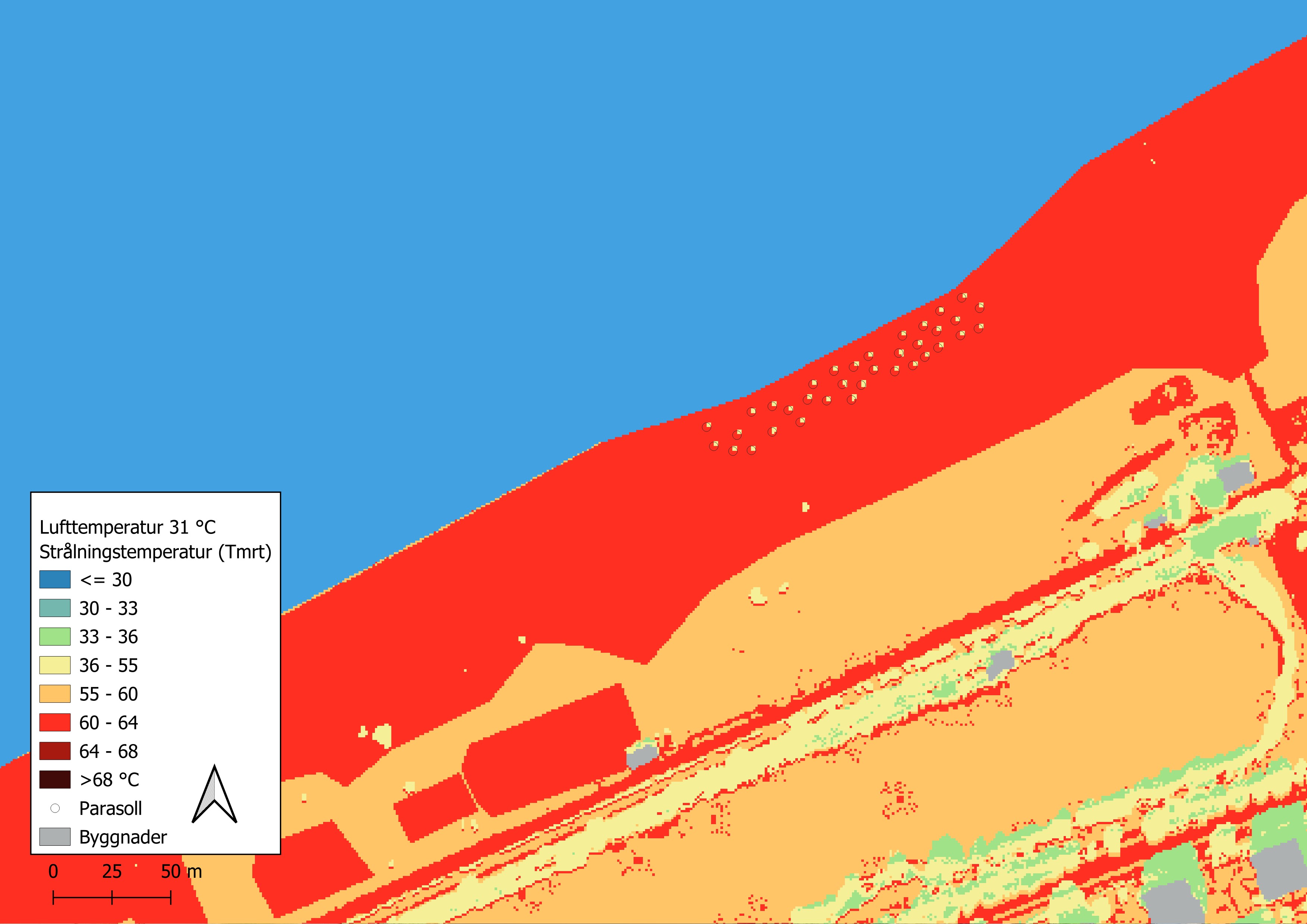 - När lufttemperaturen är 26 grader (°C) är delar av stränderna röda på kartbilderna med strålningstemperaturer på över 60 grader vilket innebär en höjd mortalitetsrisk på 10 procent för den nämnda målgruppen, och en höjd mortalitetsrisk på 5 procent även för människor mellan 45–79 år.
