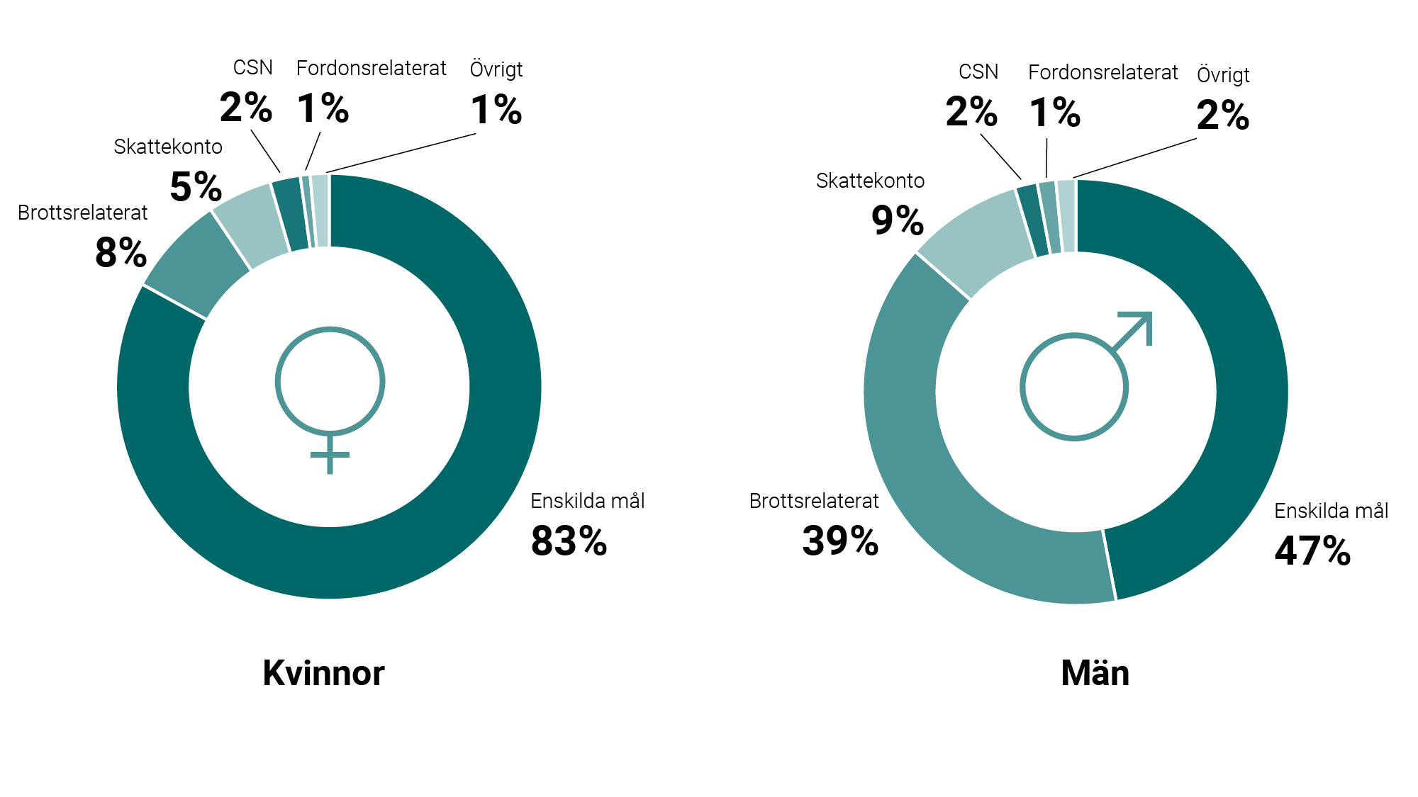 Skälet till skulderna skiljer sig också åt mellan könen. För båda grupperna är enskilda mål – det vill säga skulder till företag eller privatpersoner – den vanligaste typen av skuld, men andelen är betydligt större hos de unga kvinnorna (83 procent av kvinnornas totala skuld är enskilda mål, 47 procent av männens). För unga män står brottsrelaterade skulder, till exempel skadestånd till brottsoffer, för 39 procent av skuldsumman, medan motsvarande siffra är 8 procent för de unga kvinnorna. (Se diagram.)