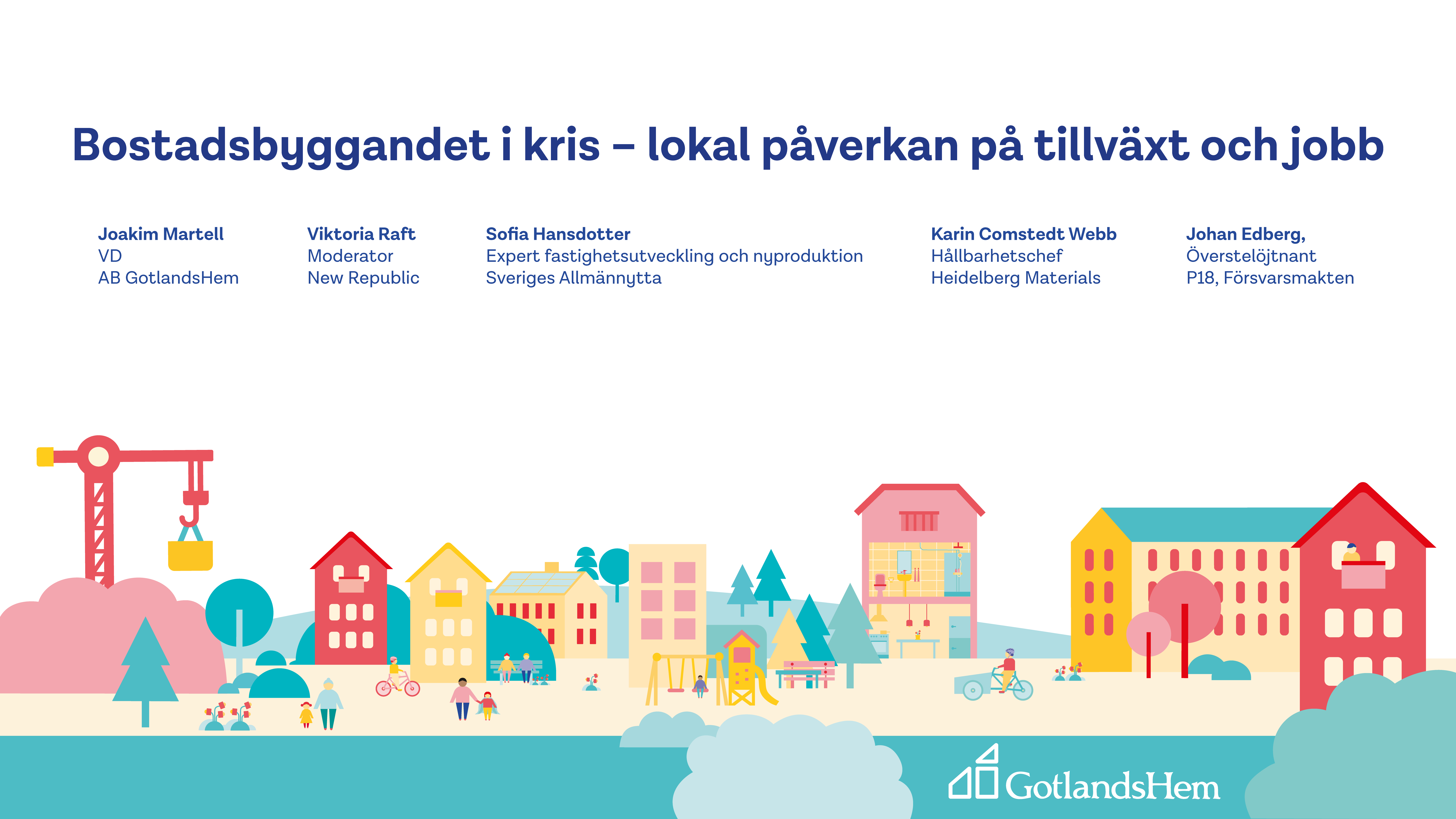 Under moderering av Viktoria Raft, New Republic, kommer en panel bestående av representanter från GotlandsHem, Sveriges Allmännytta, Försvarsmakten och Heidelberg Materials diskutera de lösningar som krävs från politiker och beslutsfattare för att bostadsbyggandet ska starta igen.