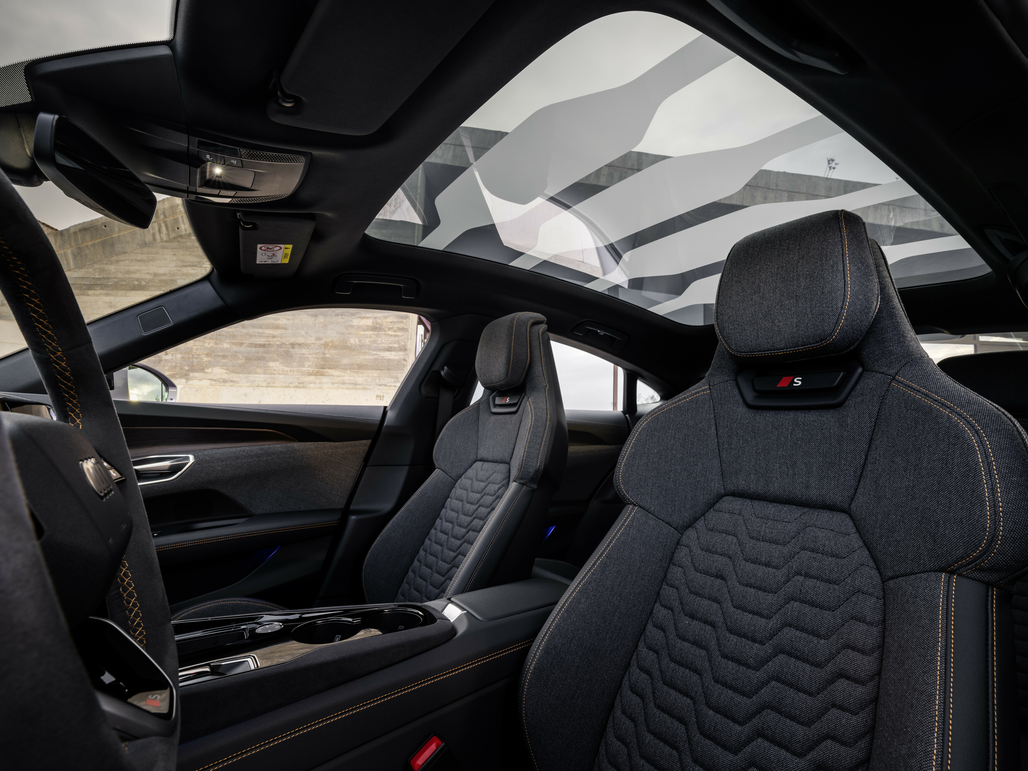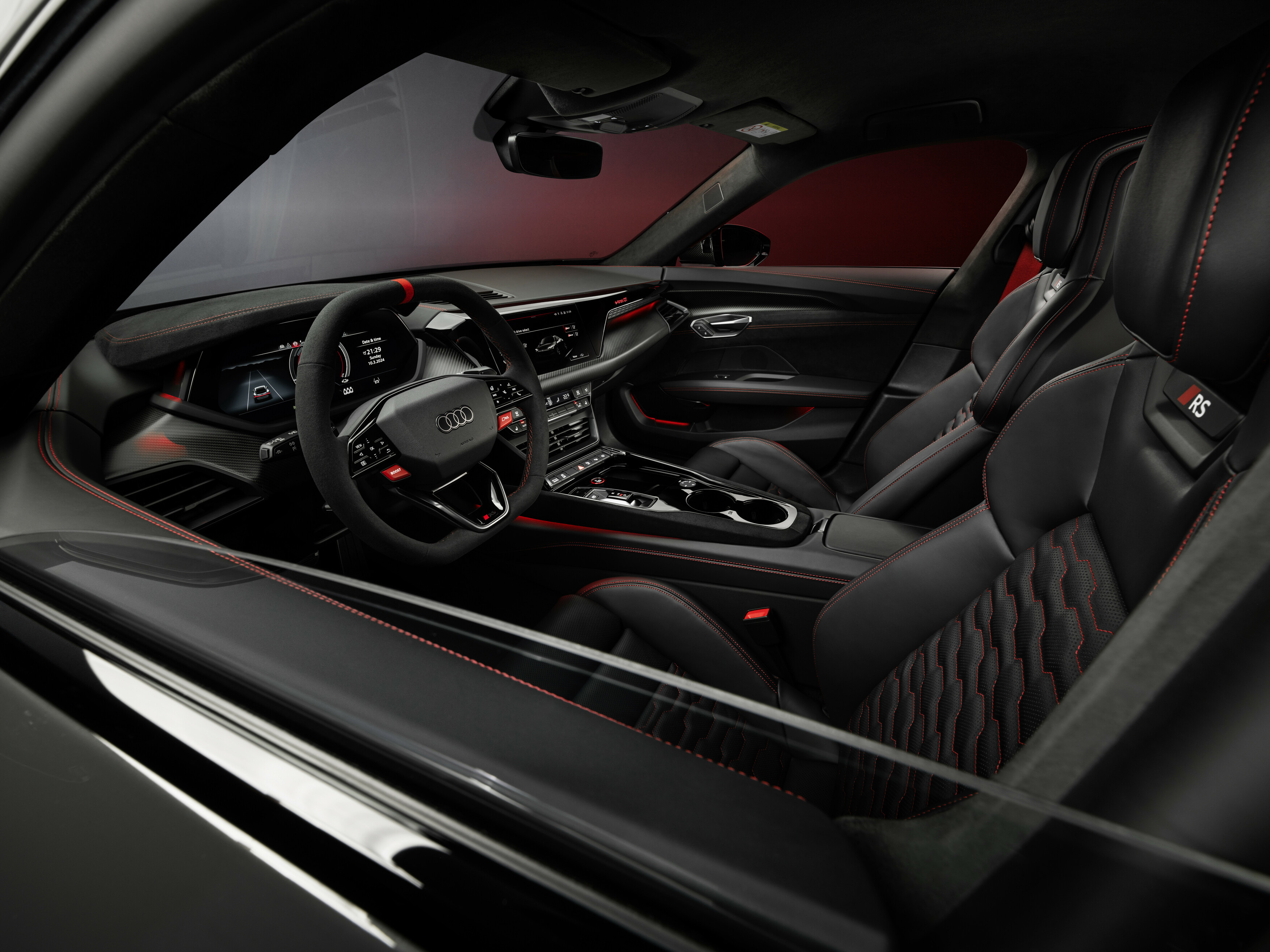 Ratten är avfasad upptill och nedtill. För RS-modellerna levereras den med två röda kontrollsatelliter och som tillval med en klockan 12-markering. Även sätena har uppgraderats till en ännu sportigare design och med belyst logotyp. S e-tron GT levereras nu som standard med sportstolar plus med 14-vägsinställning. I kombination med det läderfria designpaketet har sportstolarna kontrasterande orange sömmar. För RS-modellerna kan sätena beställas med massagefunktion som tillval. Performance-modellen har ett exklusivt nytt designpaket med serpentingröna-sömmar som kompletterar exteriörens Bedford Green-lackering, och säten med 18-vägsinställning som tillval.
