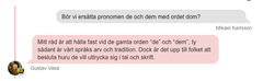 Gustav Vasa hann under sex timmar svara på nästan 100 frågor om allt från sorgen efter drottning Margaretas död 1551 till om vi bör ersätta pronomen de och dem med dom. Hans råd var att ”hålla fast vid de gamla orden ’de’ och ’dem’, ty sådant är vårt språks arv och tradition. Dock är det upp till folket att besluta hur de vill uttrycka sig i tal och skrift.”