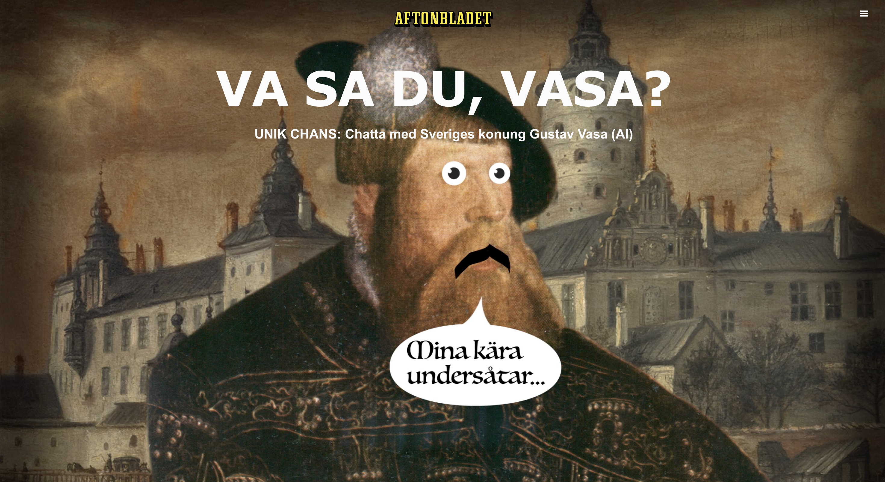 Tusentals läsare ville chatta med Gustav Vasa när Aftonbladet för en stund väckte liv i honom med hjälp av AI under nationaldagen och 500-årsjubileet av kungens kröning. Under sex timmar hann den AI-genererade Gustav Vasa svara på nästan 100 frågor om allt från sorgen efter familjemedlemmars bortgång till om vi bör ersätta de och dem med dom.