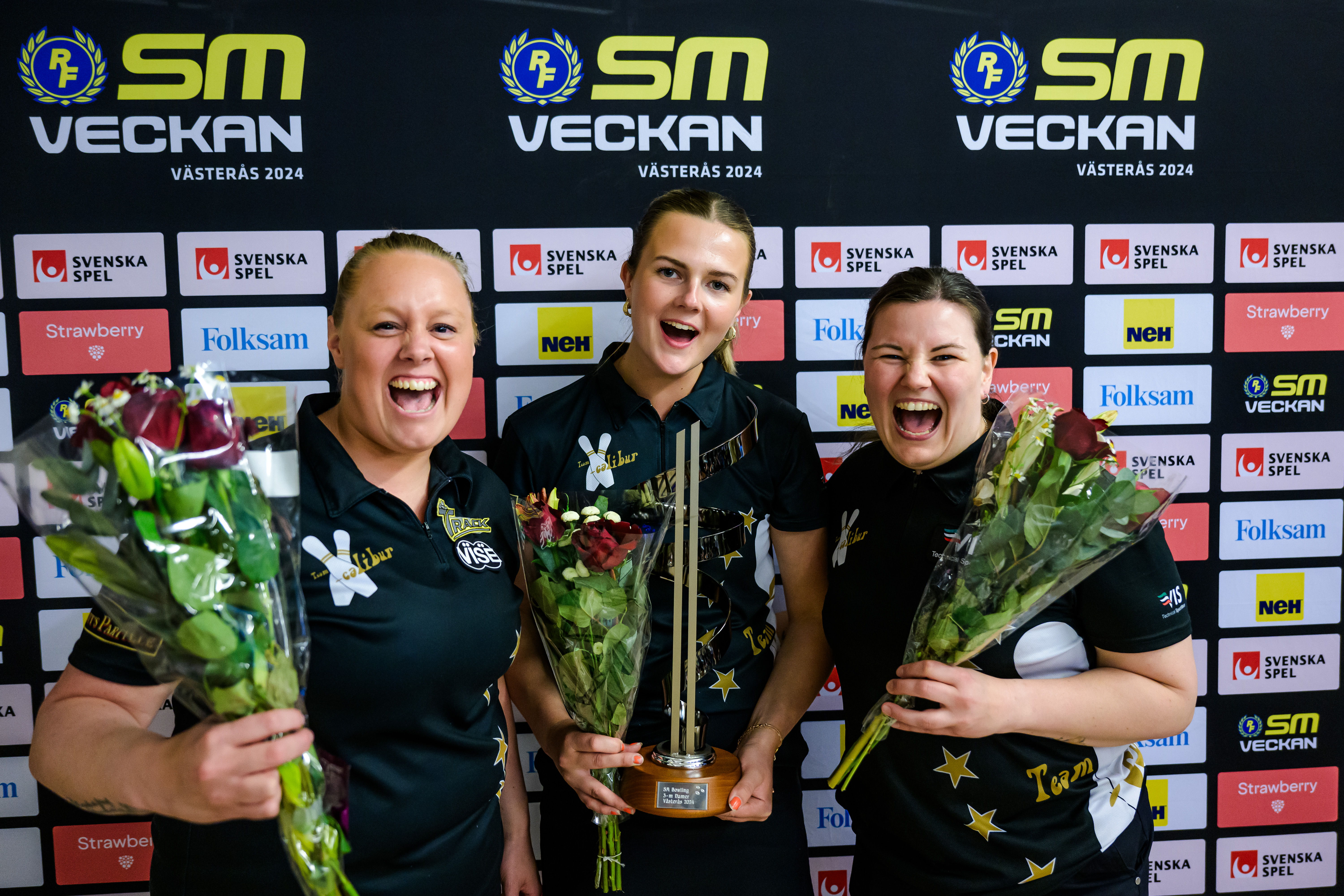 Team X-Calibur är svenska mästare i damernas 3-manna. I gårdagens final besegrade de BK Femtionian med 359-342.