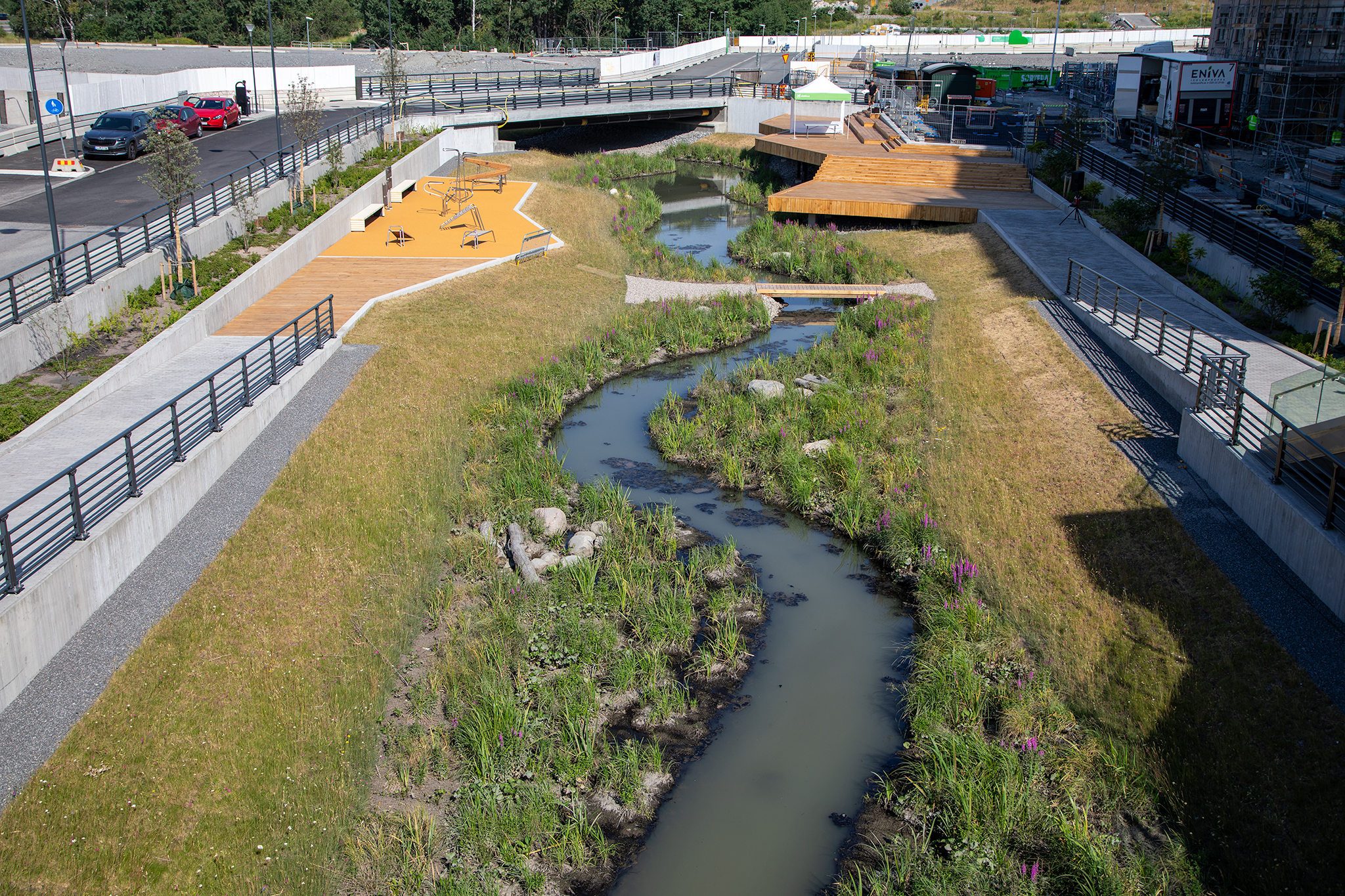 – I arbetet med Å-rummet har vi hela tiden haft fokus på hållbarhet, att kunna hantera höga vattenflöden, uppnå miljökvalitetsnormer för vatten och samtidigt bygga en plats som är estetiskt tilltalande och bjuder in till aktivitet och möten mellan människor. Jag tycker vi har lyckats väldigt bra, säger Toni Chmielewski, projektchef Barkarbystaden.