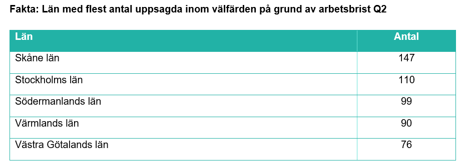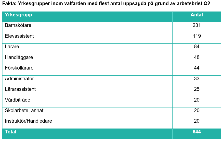 Under årets andra kvartal har 866 medarbetare i välfärden blivit uppsagda på grund av arbetsbrist. Det innebär en ökning med 151 procent i relation till samma period förra året, då 345 medarbetare blev uppsagda på grund av arbetsbrist. Hittills i år har 1 282 personer blivit uppsagda, vilket kan jämföras med 959 medarbetare under hela 2023. Den mest drabbade yrkesgruppen är barnskötare, följt av elevassistenter och lärare.
