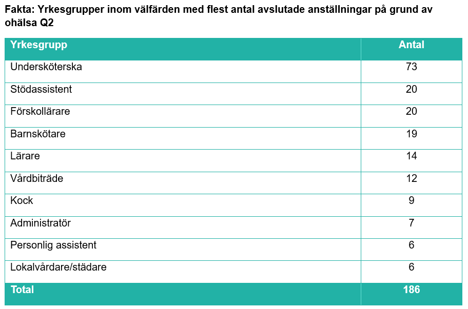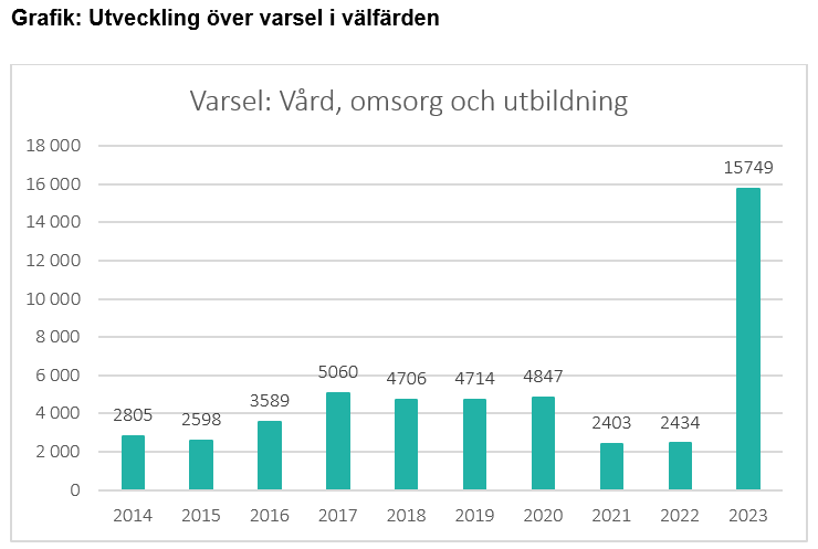 Detta kan ses som en naturlig följd av de många varsel som lades under 2023 och första halvåret 2024. Varselstatistik från Arbetsförmedlingen visar att antalet varsel inom välfärden ökade drastiskt under 2023 i relation till de senaste 10 åren. Under åren 2014 till 2022 varslades i genomsnitt 3 684 personer årligen inom välfärden. 2023 varslades hela 15 749 personer. Under årets andra kvartal varslades 2 852 personer inom välfärden¹.