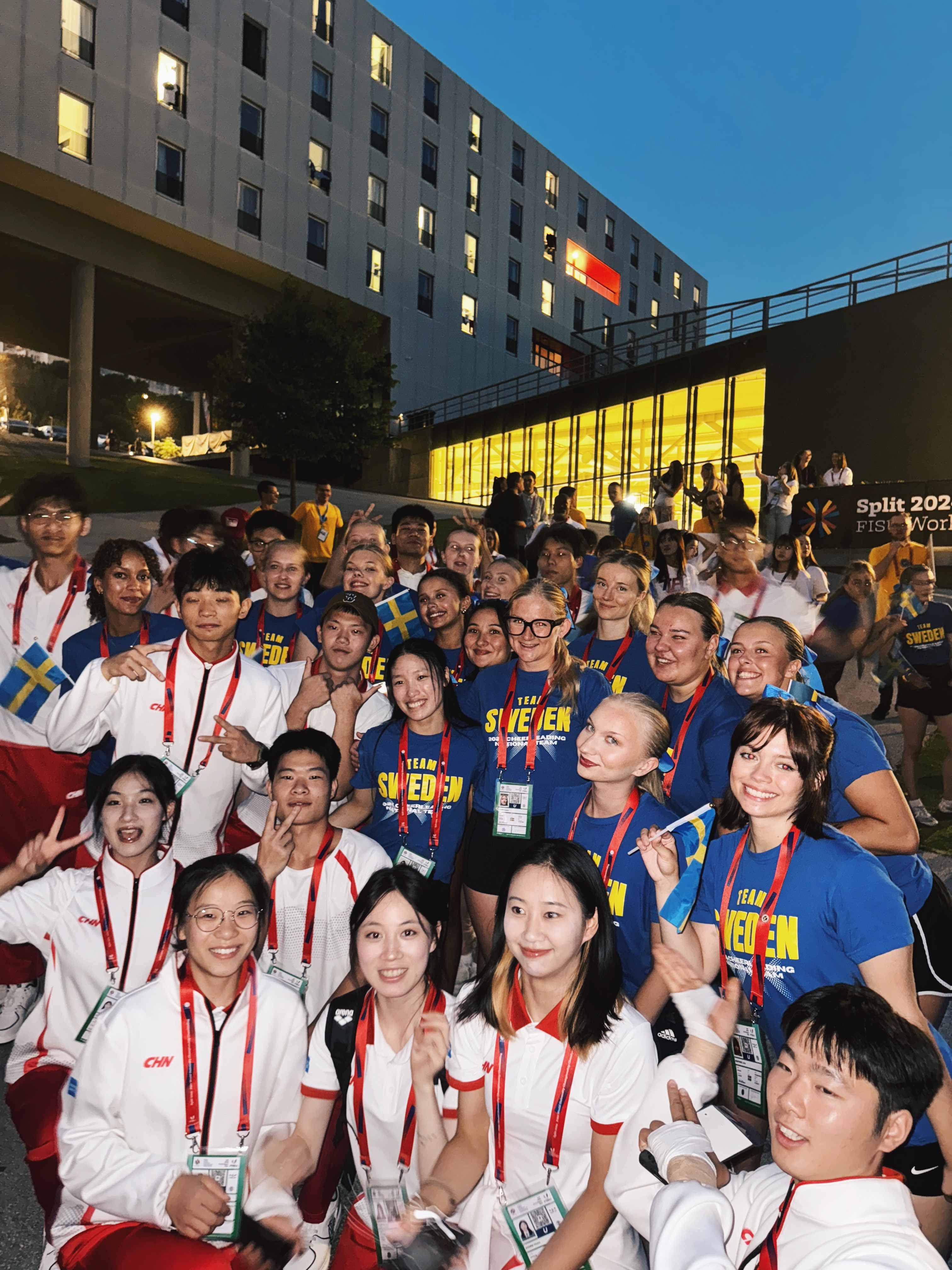 I går ankom Sveriges universitetslandslag till Split och deltog på träning och öppningsceremoni. I dag är det dags att ladda upp inför första tävlingsdagen. Sverige tävlar i klassen Coed Elite, vilket innebär att det är ett mixat lag med både killar och tjejer. I klassen möter de Australien och Kina, två starka länder inom cheerleading.