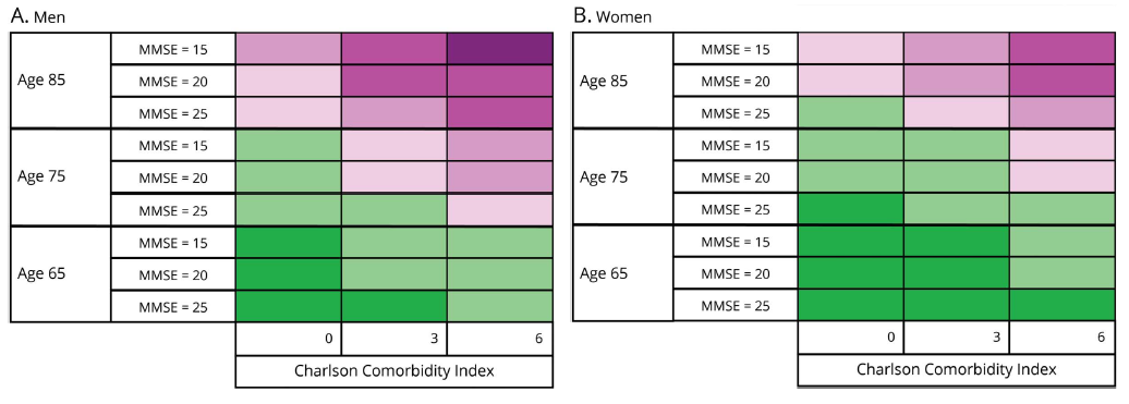 Graphics: Tables illustrate three-year survival probabilities for people with dementia diseases diagnosed in primary care. Dark green indicates a low risk of death while dark purple indicates a high risk of mortality within three years.