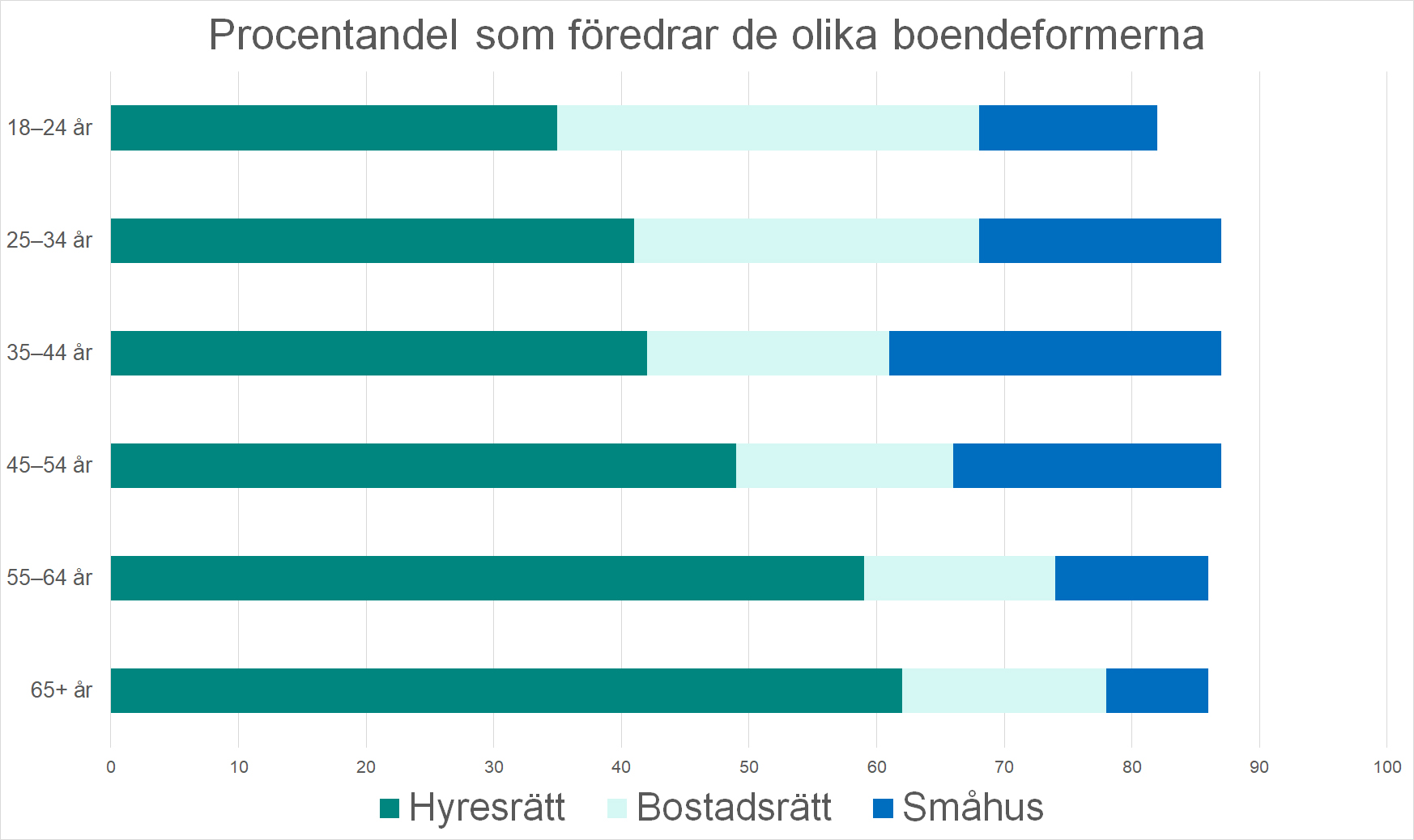 Den grupp i undersökningen som är mest intresserad av att bo i bostadsrätt är 18–24-åringarna och den som är mest intresserad av småhus är 35–44-åringarna. Hyresrätten har en stor andel i samtliga åldersgrupper men är allra populärast i gruppen 65+.