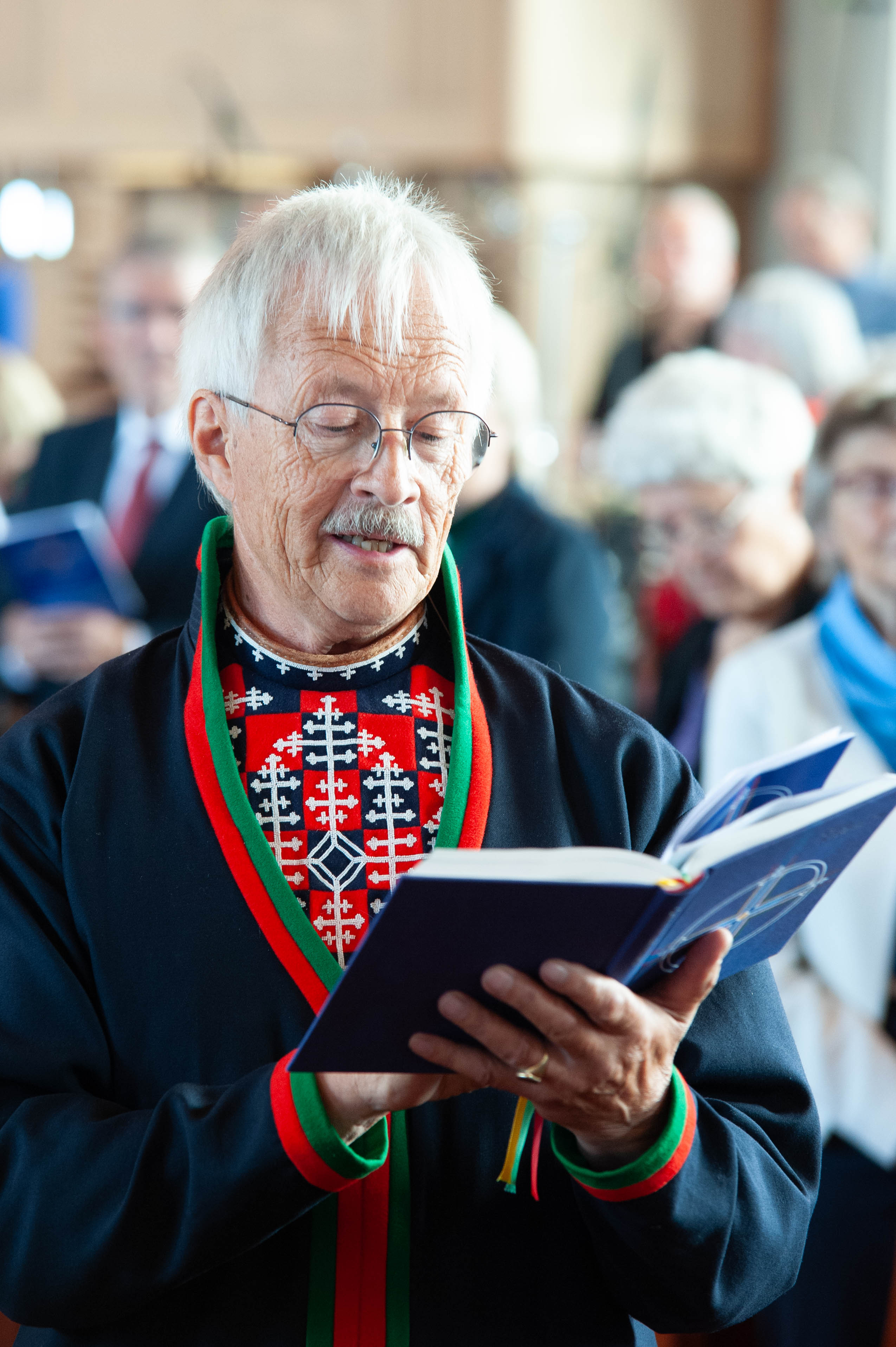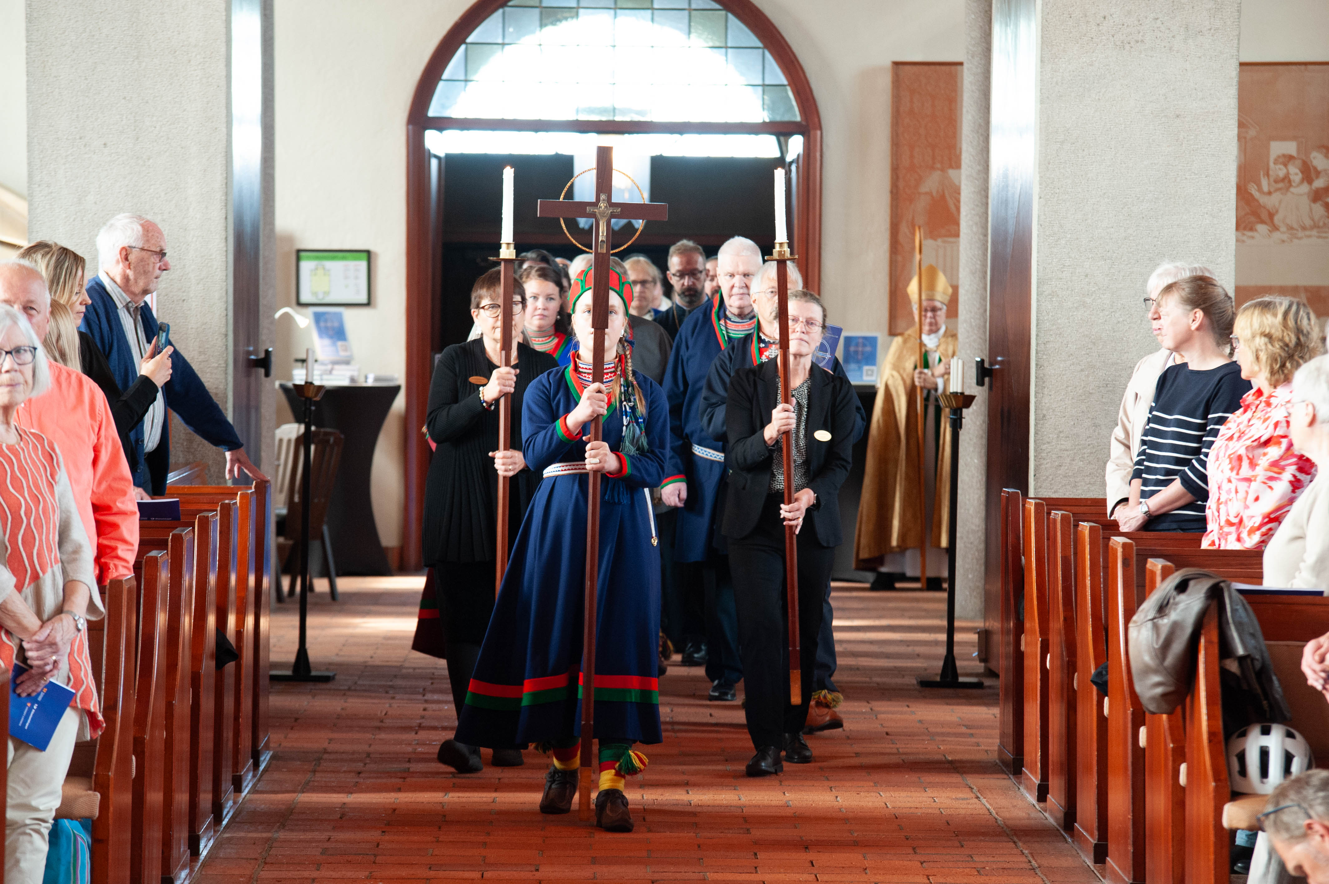 Stämningen i Stora kyrkan var hjärtlig och lite högtidlig. Till stämningen bidrog de musiker och sångare som under gudstjänsten framförde delar av den arktiska mässan Aejlies Gaaltije – Den heliga källan, skriven av den norske kompositören Frode Fjellheim.