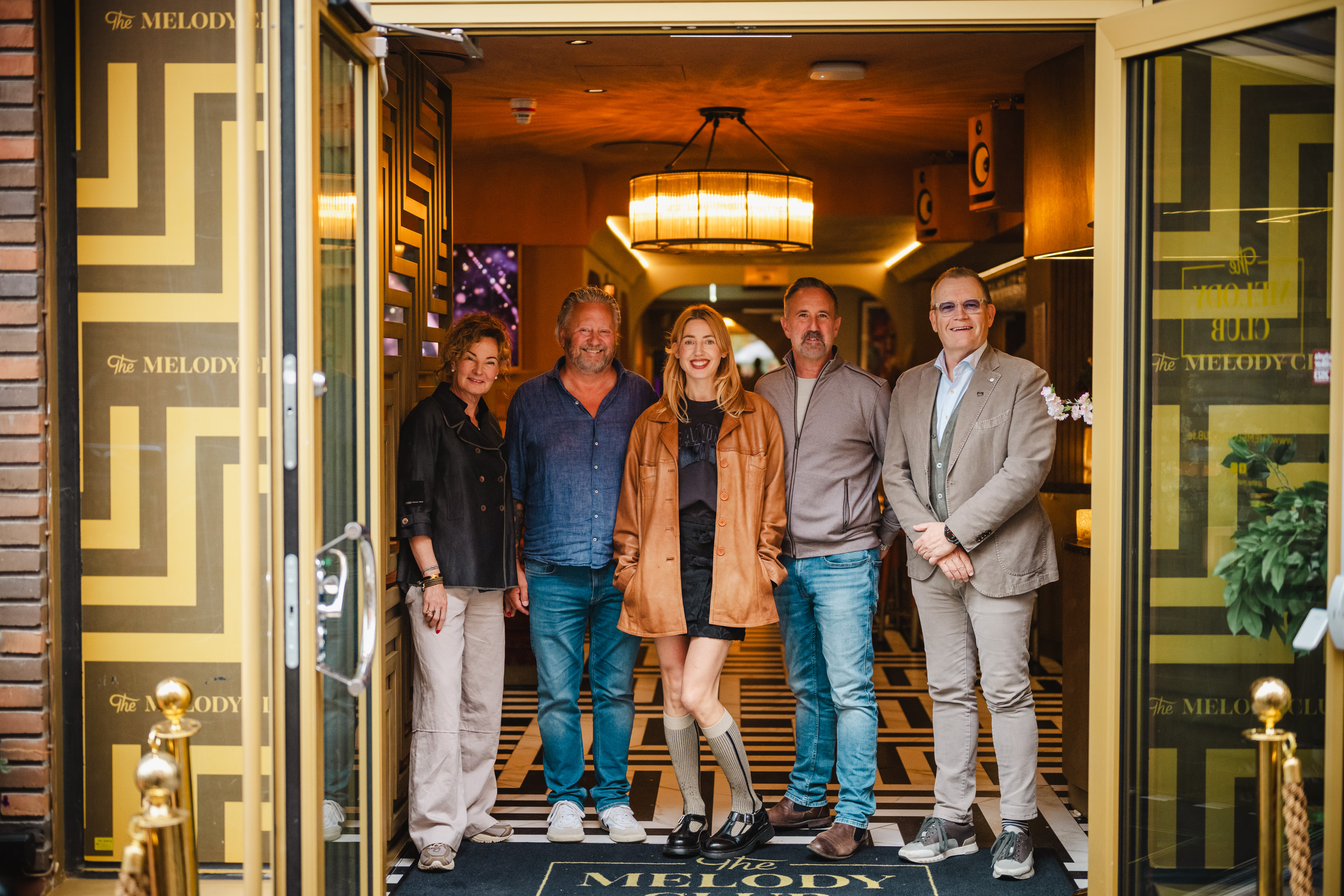The Melody Clubs delägare står i entrén till The Melody Club i Göteborg. Från vänster: Jessica Ekelöf Larsson, Fredrik Mattson, Veronica Maggio, Christian Maggio, Magnus Larsson