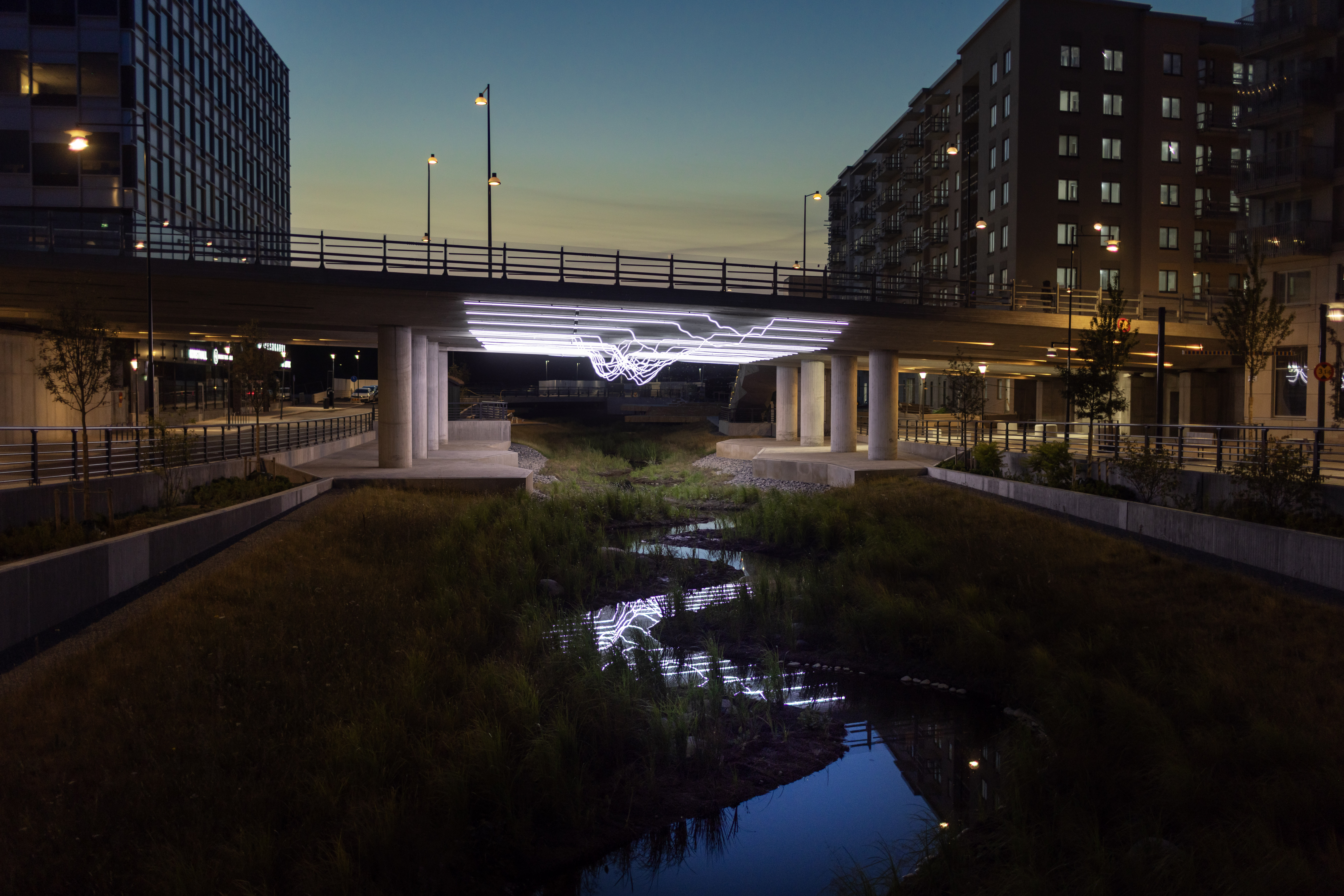 Det är all denna komplexitet som jag gärna vill att konstverket ska kunna associera till. Alltså till både tid, rum, arkitektur, liv, ljus, flöde och magi. De lysande linjerna kan alltså både referera till åns dolda topografi, till en rytm, ett flöde och till vattenrörelser som strömmar fram, samtidigt som konstverket innebär en väldigt direkt och konkret rumslig gestaltning, som blir påtaglig för alla och bidrar till att skapa både trygghet, identitet och atmosfär.