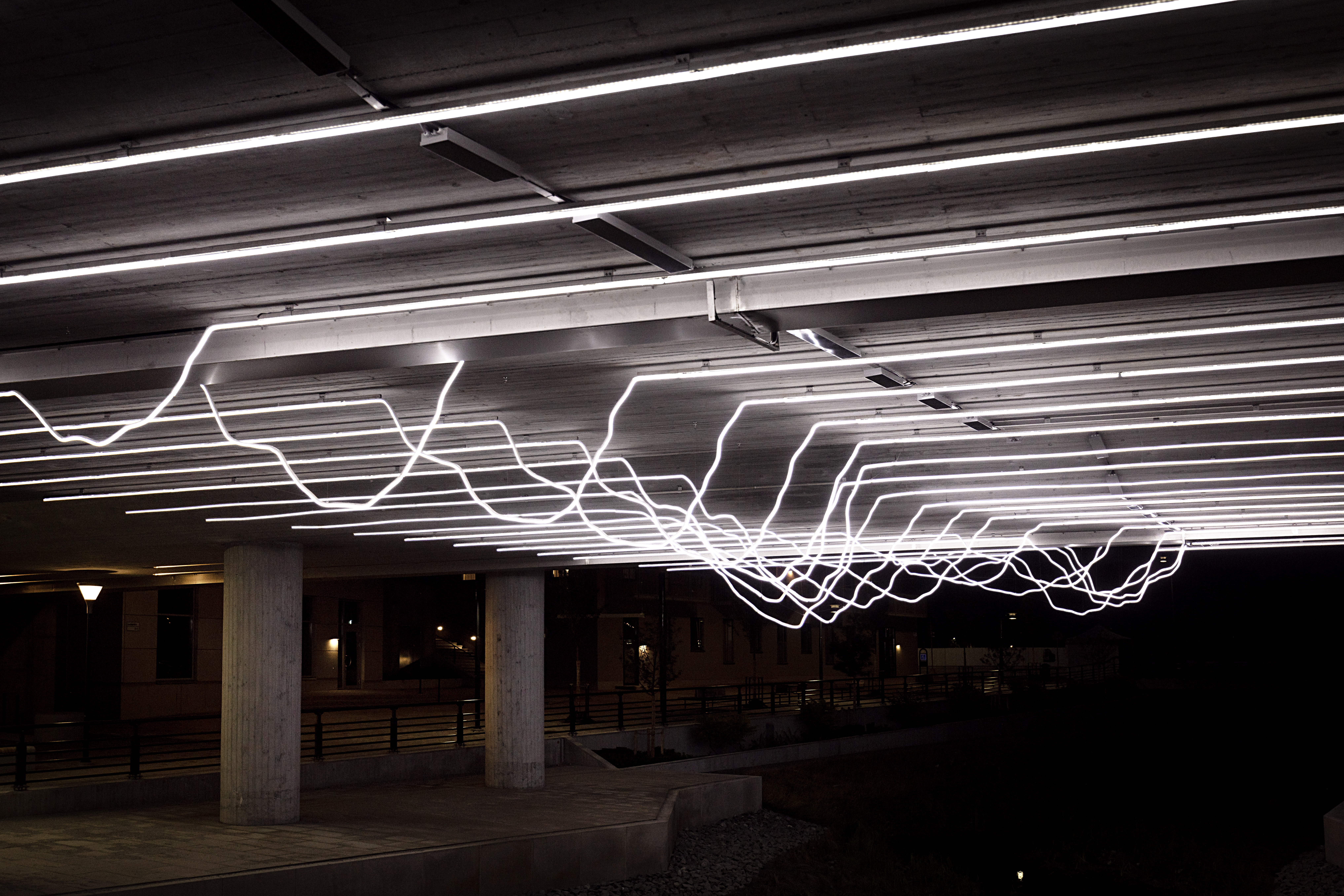 Järfälla kommun har invigt sin senaste konstinstallation i det offentliga stadsrummet. Verket består av 400 meter vita LED-neonslingor fördelat på 26 lysande linjer som sick-sackar under bron och samtidigt speglar sig i ytan av Bällstaån som stilla flyter fram på platsen.