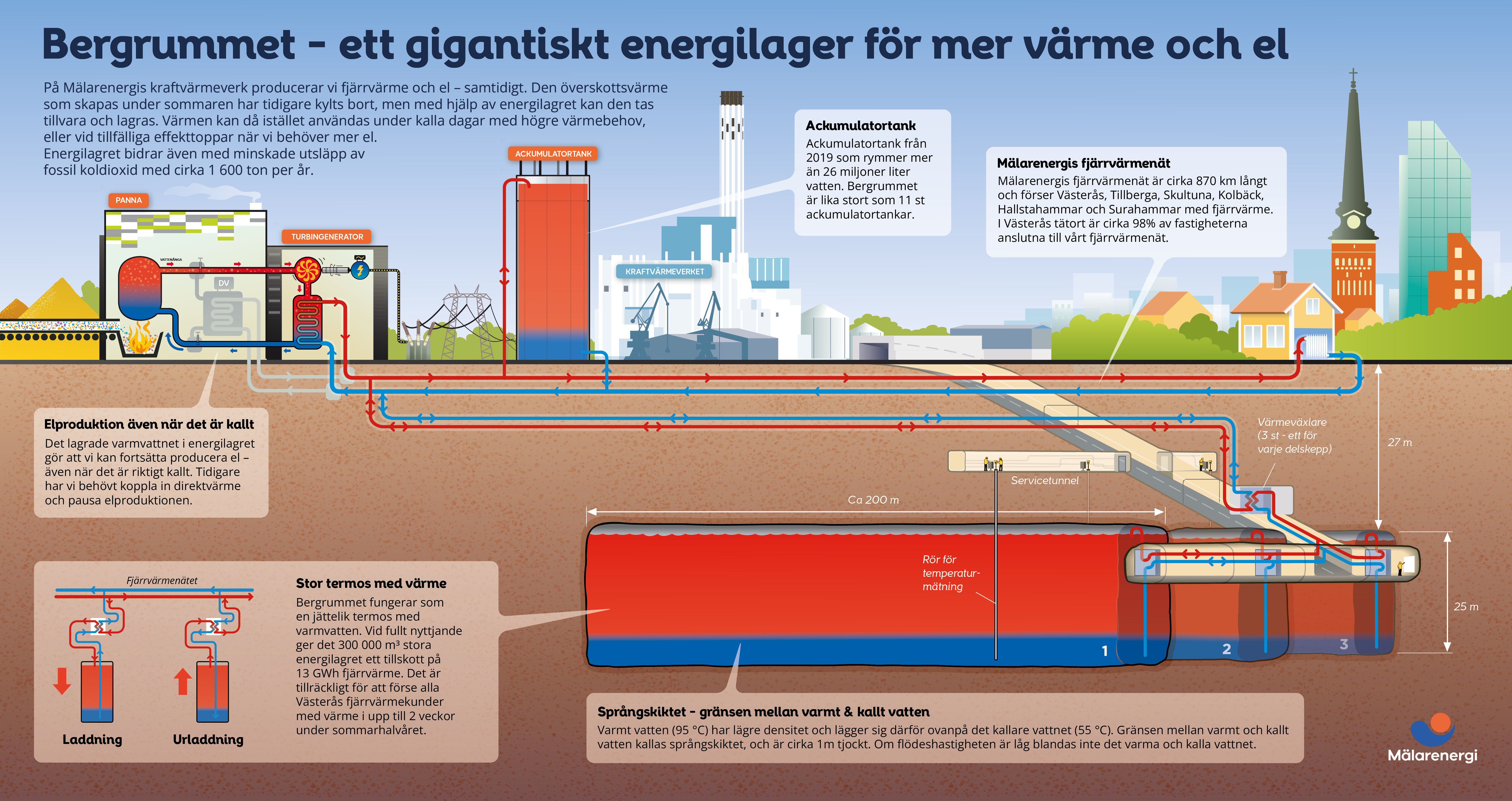 Mälarenergi har skapat ett gigantiskt underjordiskt värmelager i Västerås. "En industrihistorisk satsning som både minskar utsläppen av fossil koldioxid och skapar förutsättningar för högre elproduktion vintertid", säger Mälarenergis Magnus Eriksson. Den 12 september invigs energilagret, med närvaro av H.M. Konungen.