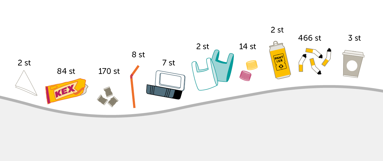 Vilket typ av skräp skulle du se då? Jo, du skulle du passera 466 fimpar, 170 snusprillor, 84 godispapper eller andra mjuka omslag av plast, 14 lösa korkar eller kapsyler, 8 sugrör, 7 engångsmatlådor och lock till dessa, 3 engångsmuggar och lock till dessa, 2 plastpåsar, 2 pantburkar och 2 våtservetter. Av de nästan 1000 skräp du passerar skulle över 600 av dem vara engångsplastprodukter.