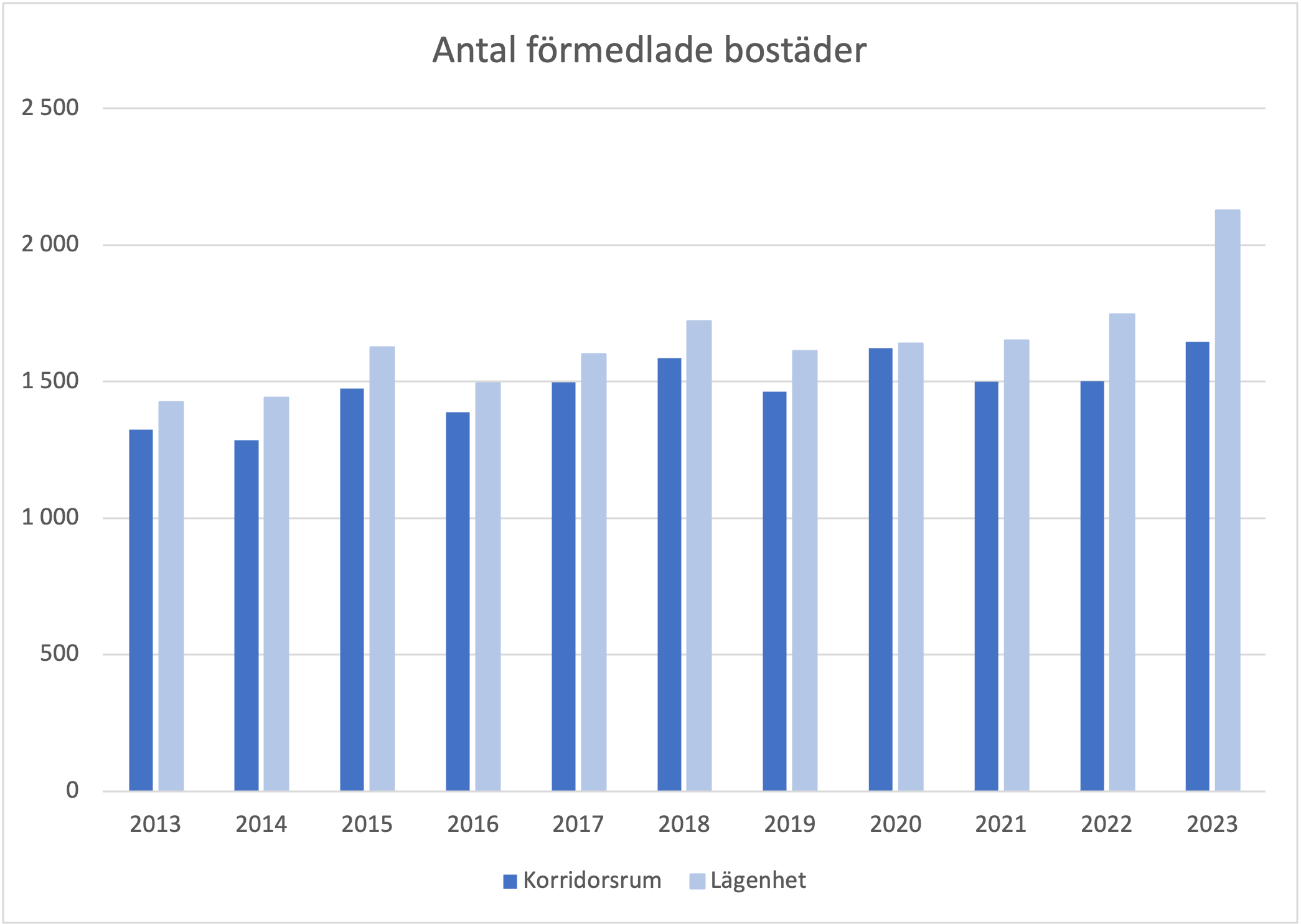 Sedan 2020 har SSSB producerat i snitt 380 nya bostäder varje år. Antalet förmedlade bostäder har ökat från 1335 korridorsrum under 2013 till 1645 korridorsrum under 2023, samt från 1426 lägenheter under 2013 till 2128 lägenheter under 2023.