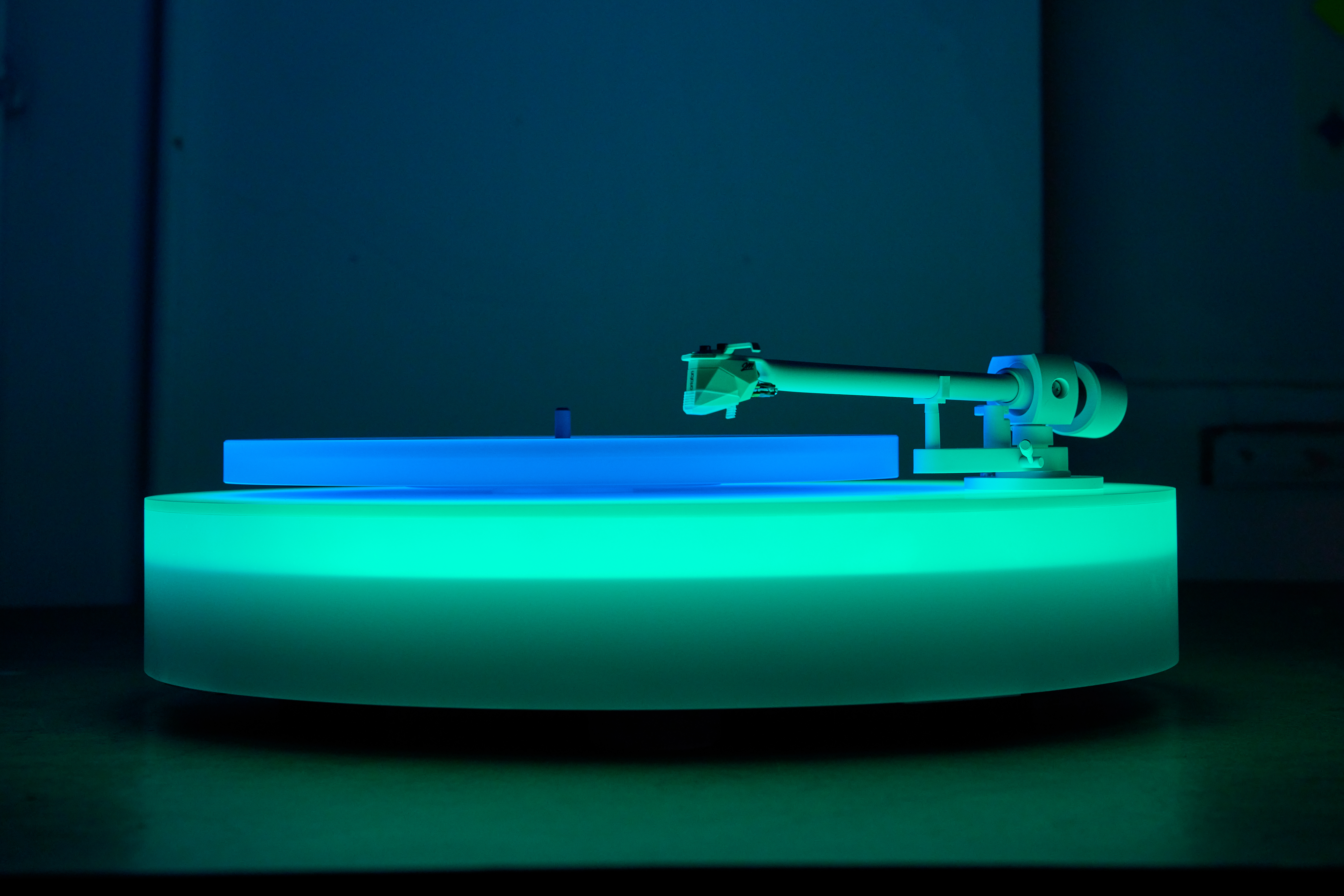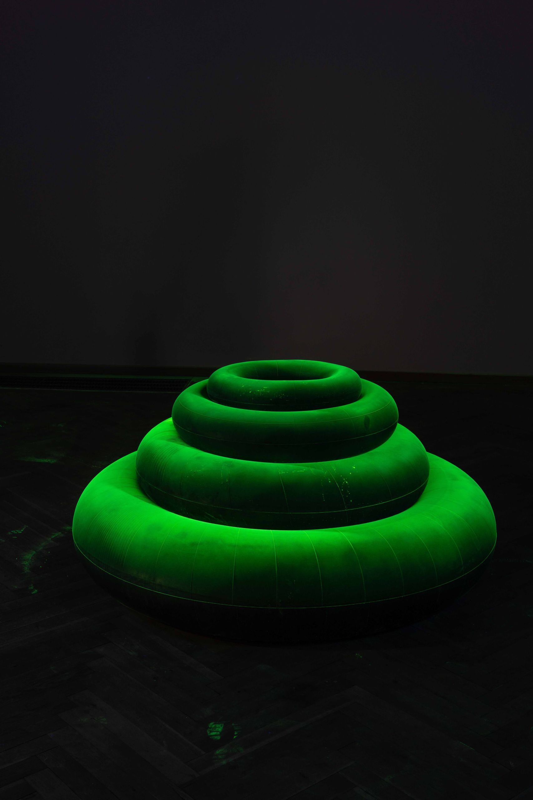 Här visas ambientgenrens självaste upphovsman Brian Enos nya verk "Turntable II" (2024), i form av en ljusskiftande skivspelare i neonfärger, där skivor ur artistens egen imponerande diskografi spelas upp. Intill visas också danska Lea Porsagers uppblåsbara UV-skulptur "Ultimate Physical Atom" (2021), en säregen synvilla där partikelfysik möter spiritism.
