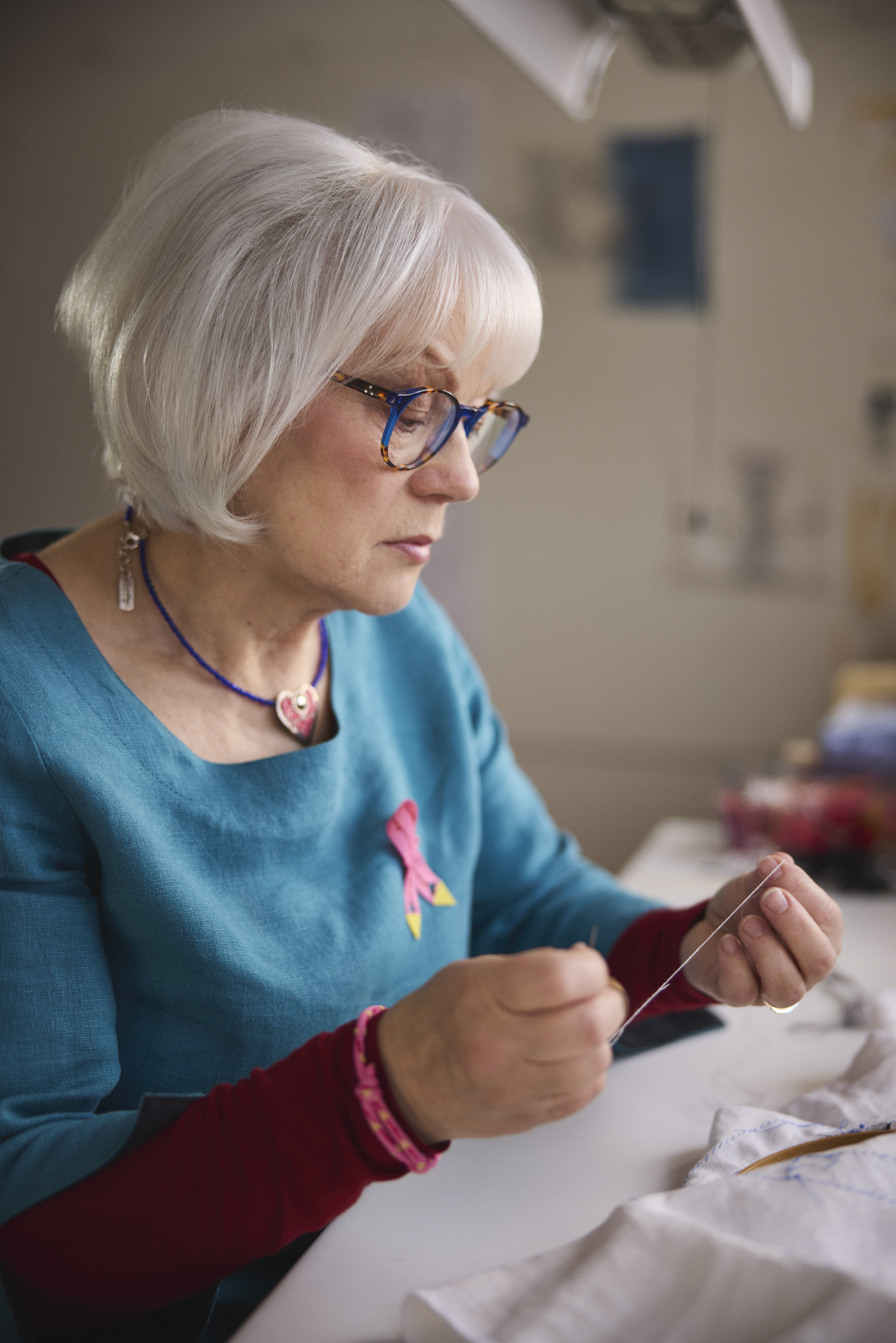 Britta Marakatt-Labba har varit verksam i 40 år med broderi och motiv från samernas historia, samtid och mytologi. Hon hade en dröm om att få designa Cancerfondens rosa band, så när hon fick frågan hade tankeprocessen pågått länge och hon visste redan hur det skulle se ut.