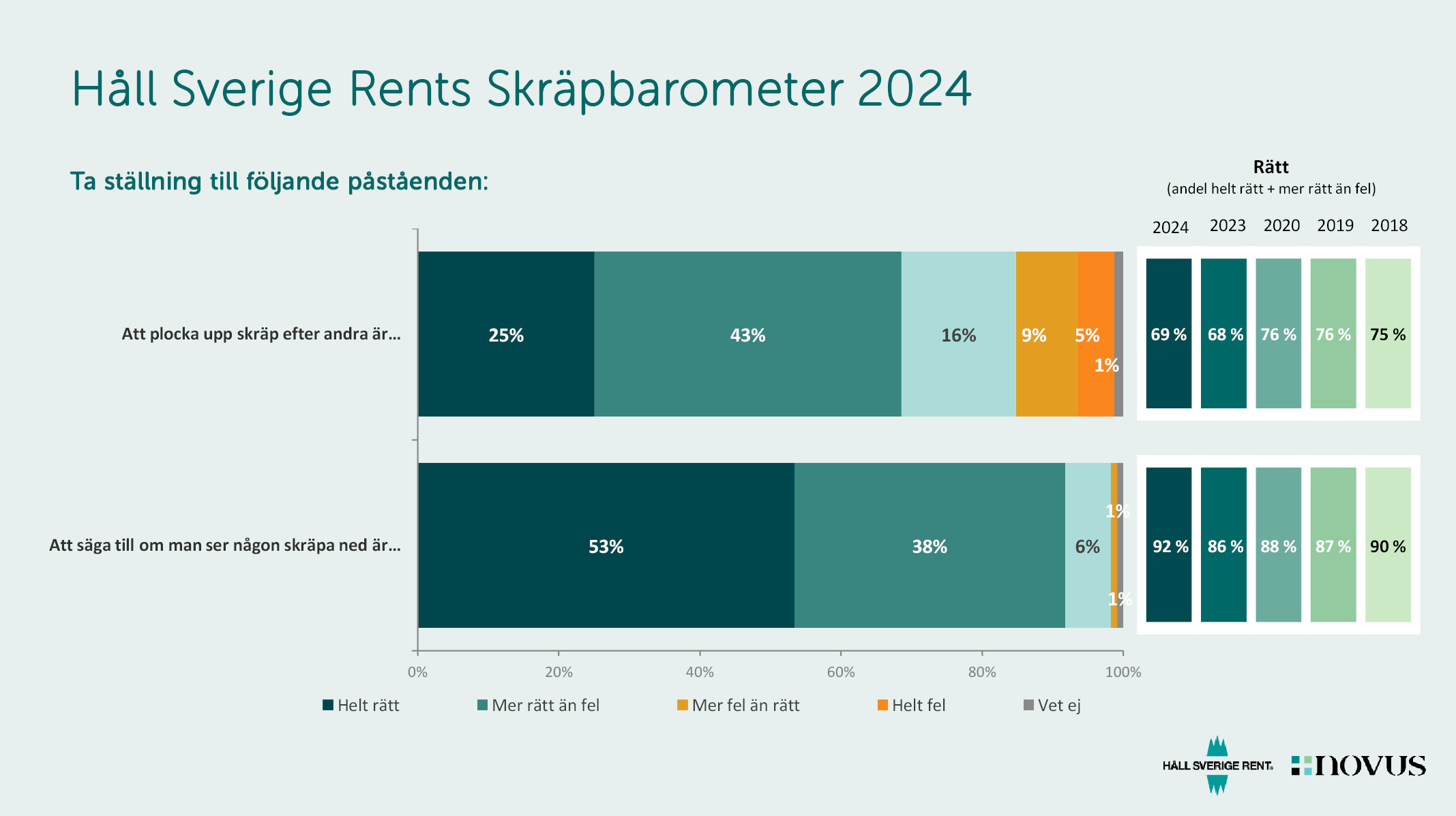 De flesta svenskar uttrycker en stark vilja att agera mot nedskräpning. 7 av 10 tycker att det är rätt att plocka upp skräp efter andra och fler än någonsin, drygt 9 av 10, anser att man bör säga till den som skräpar ner. Trots detta är det endast 1 av 10 som faktiskt har sagt till en nedskräpare. Det visar Håll Sverige Rents årliga Skräpbarometer som bygger på en undersökning av Novus.