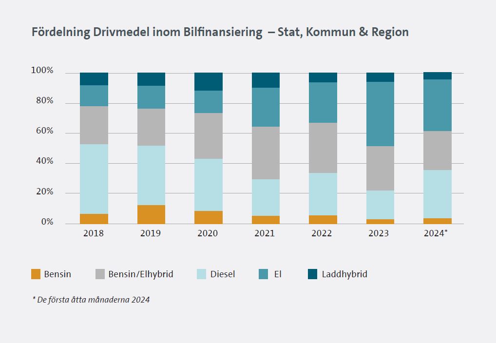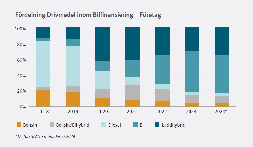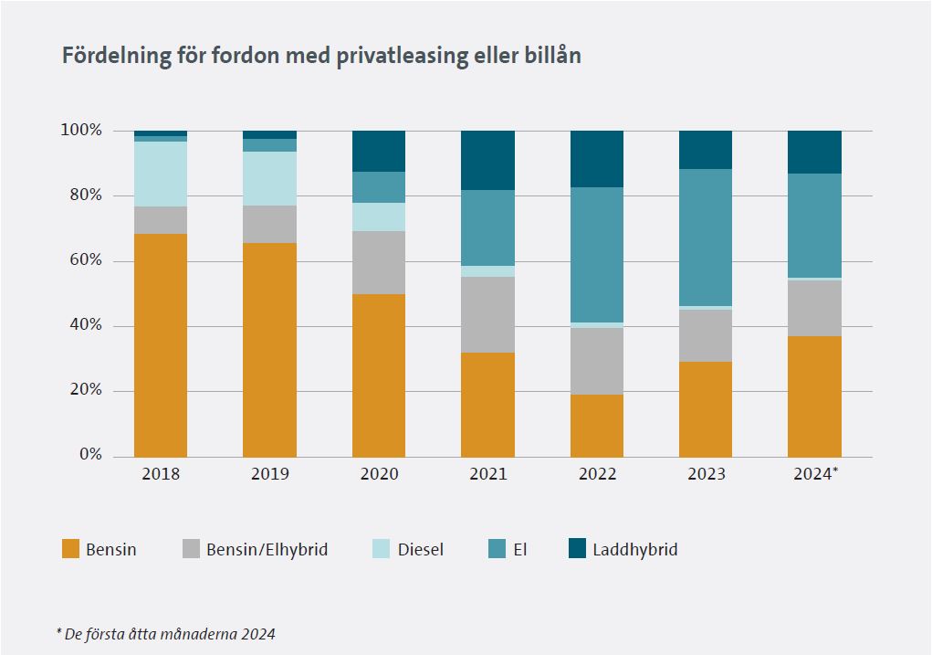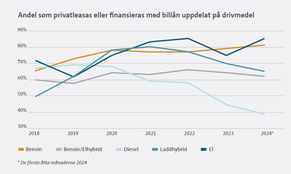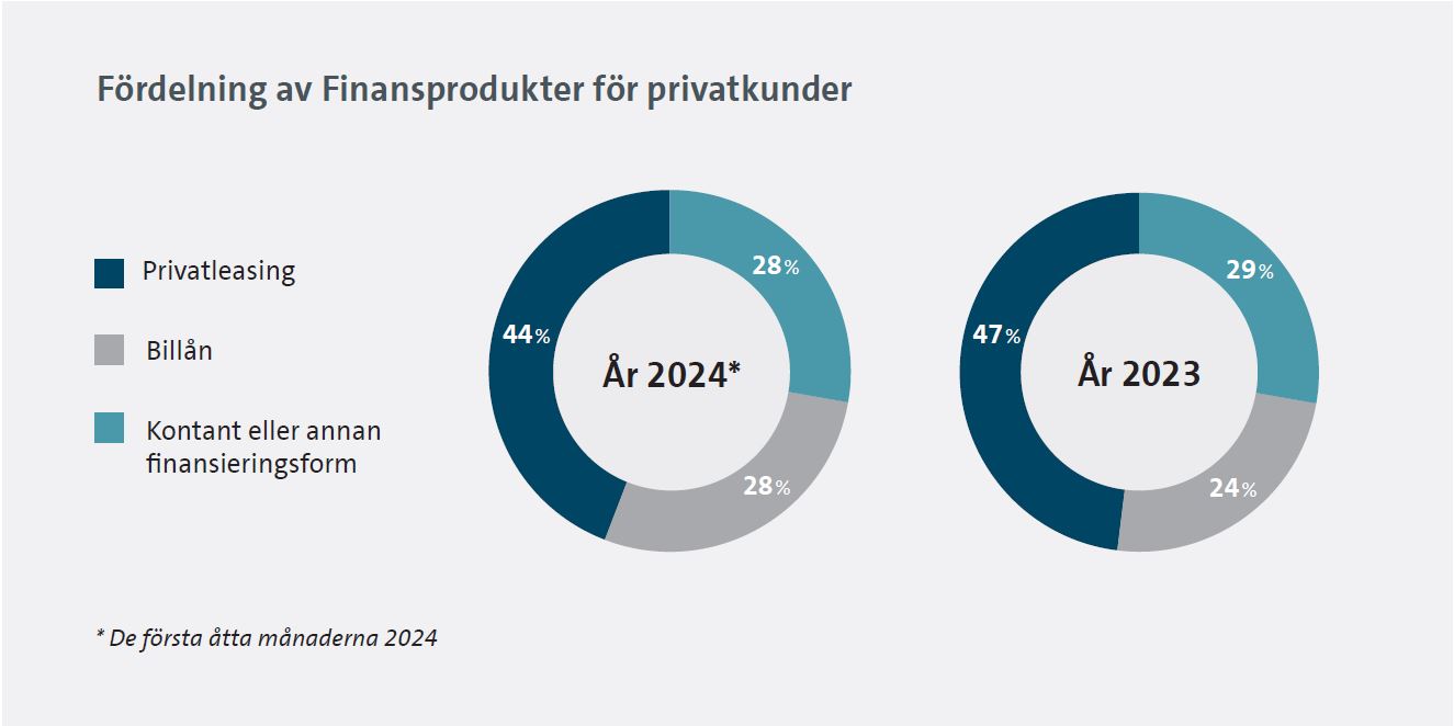 Hela 72 procent av dem som skaffar en ny bil finansierar den via ett finansbolag, antingen med privatleasing eller i form av billån med bilen som säkerhet. Privatleasing står ensamt för 44 procent, en minskning från 47 procent motsvarande period förra året. Minskningen kan förklaras av att det förra året levererades många bilar som beställdes under 2022 då det skedde en topp i beställningarna inför slopandet av klimatbonusen.