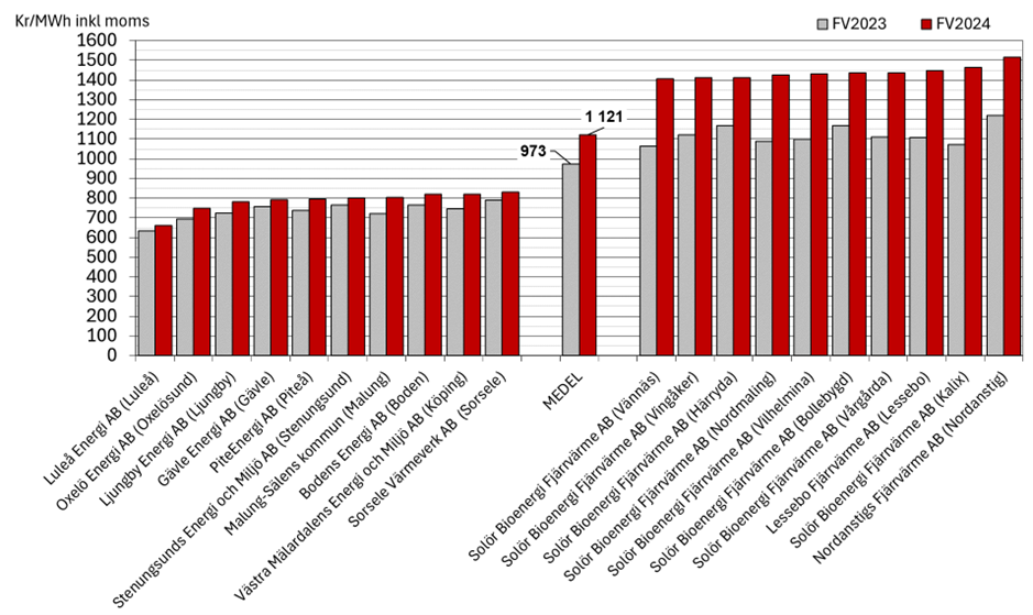 Underlaget är till största delen hämtat från Energiföretagen Sveriges prisstatistik och avser fjärrvärmepriset i kommunernas centralort.