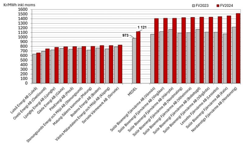 Högst höjning i procent står Nevel Energi i Åstorp för, de höjer priset med 39 procent tätt följt av Vimmerby energi & miljö med 38,6 procent och Örkelljunga Fjärrvärmeverk som höjer fjärrvärmepriset med 37,8 procent. Dyrast kommun är Nordanstig där man förra året sprängde 1 200 kr/MWh-gränsen men nu sprängt 1 500 kr/MWh-gränsen. Nordanstig följs av Kalix och Lessebo där priserna nu ökat till 1 463 respektive 1 447 kr/MWh. Vissa fjärrvärmebolag äger nät i många kommuner, det gör att deras prissättning får stor påverkan. Bland de bolag som äger nät i fler än fem kommuner är Nevel det bolag som höjer mest, med i snitt 27,4 procent, följt av Adven Sverige och Solör Bioenergi på 25,5 respektive 19,4 procent.