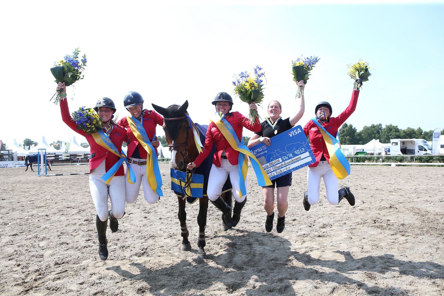 Svenska mästare i laghoppning, segrare AgriaAllsvenskanFöreningen Skästa RidcenterLouise Haaga, 37 år, Isabell Eklöf, 17 år, Emma Kåbring, 25 år, Sandra Olsson, 22 år