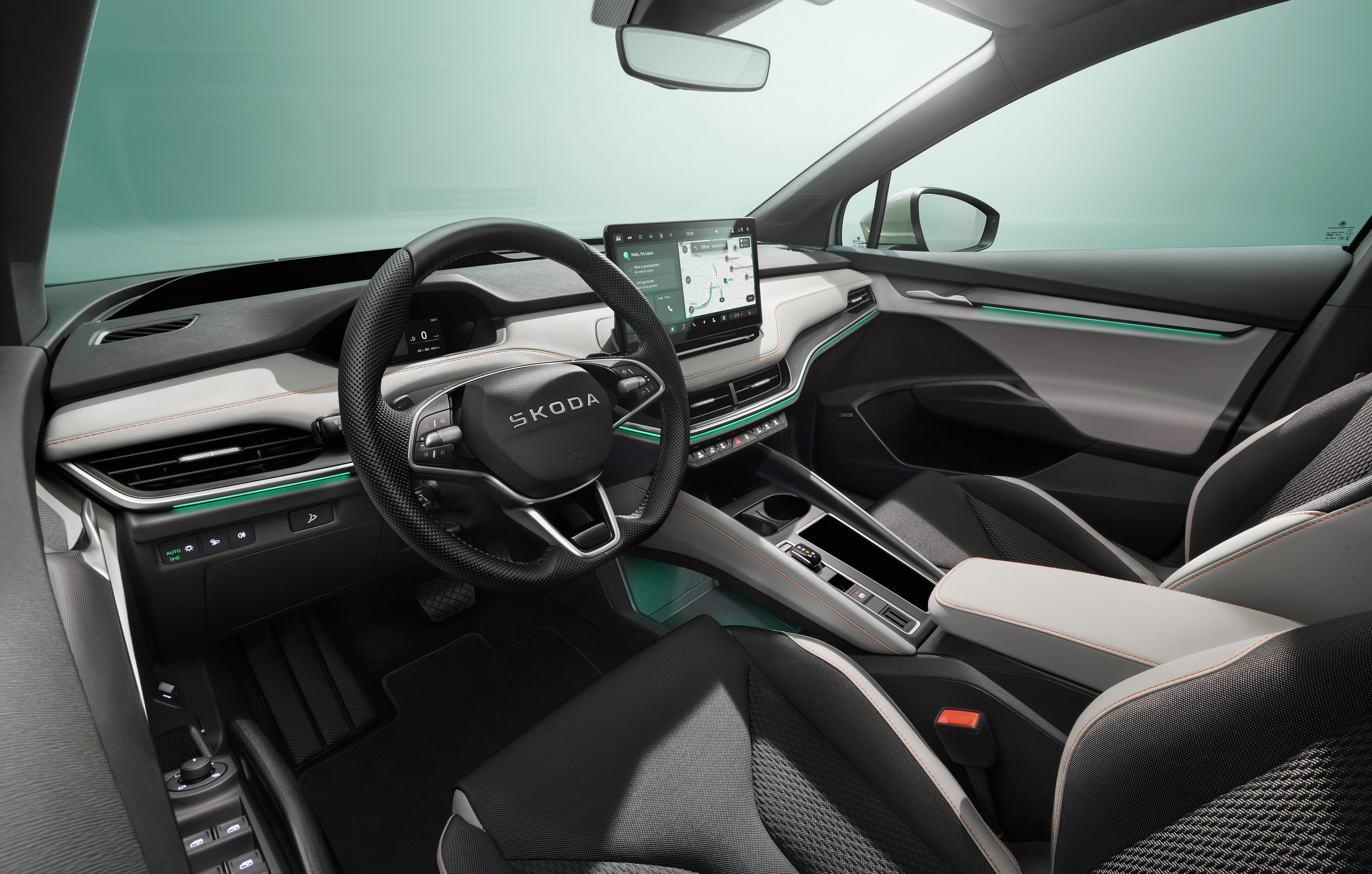 Elroq ger en generös mängd interiört utrymme. Utrymmet för baksätespassagerare är i särklass mest rymliga mot jämförbara konkurrenter – vilket gör Elroq till en perfekt bil även för familjen, då barnstolar utan problem kan monters bekvämt. Dessutom är bagageutrymmet det största i sitt segment med en bagagekapacitet på 470 liter (upp till 1 580 liter med baksätena nedfällda). En 13-tums infotainmentskärm med ett ännu mer intuitivt användargränssnitt är standard. Design Selections använder många innovativa hållbara interiörmaterial. Det finns också nya Simply Clever-funktioner, bland annat smarta fack med 48 liters lagringskapacitet och ett förvaringsnät för laddningskabeln under hatthyllan. Ett brett utbud av intuitiva anslutningsfunktioner, avancerade assistanssystem och upp till nio krockkuddar säkerställer överlägsen körkomfort och högsta nivå av aktiv och passiv säkerhet.