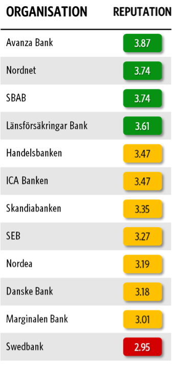 — Vi vet dessutom att den svenska allmänheten är mycket känslig för skiftningar i anseende. Svenska konsumenter tenderar i högre utsträckning att ge sitt stöd till organisationer med högt anseende än konsumenter i jämförbara länder. På motsvararande sätt är svenska konsumenter mer benägna att straffa företag med svagt anseende. Det återspeglas inom svensk banksektor där anseende och förtroende är nyckelfaktorer för att driva konkurrenskraft, kommenterar Alexander Widén.