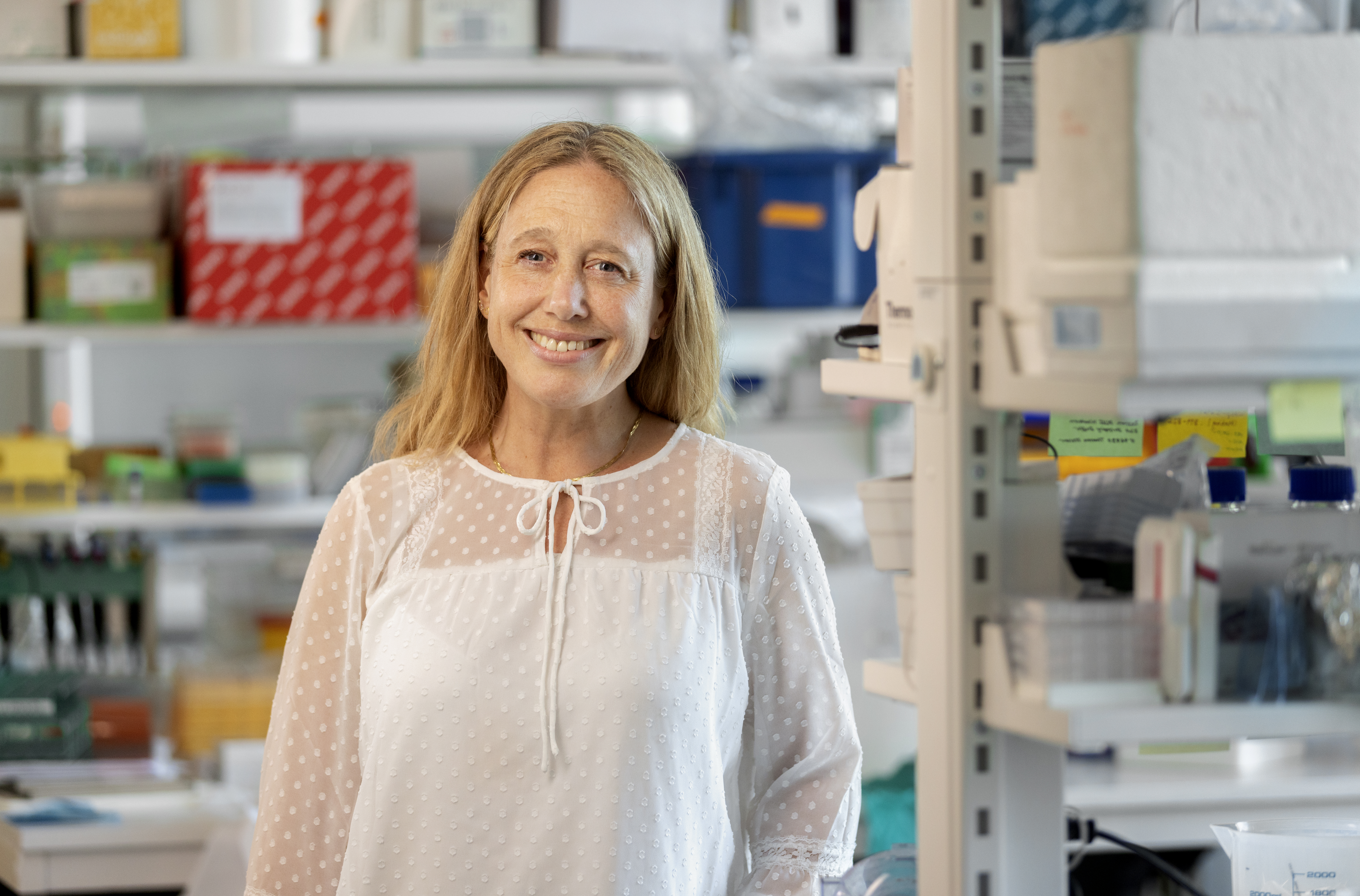 Denna bild visar Lisa Westerberg, professor i experimentell immunologi, i ett laboratorium med hyllor fyllda av forskningsmaterial i bakgrunden.