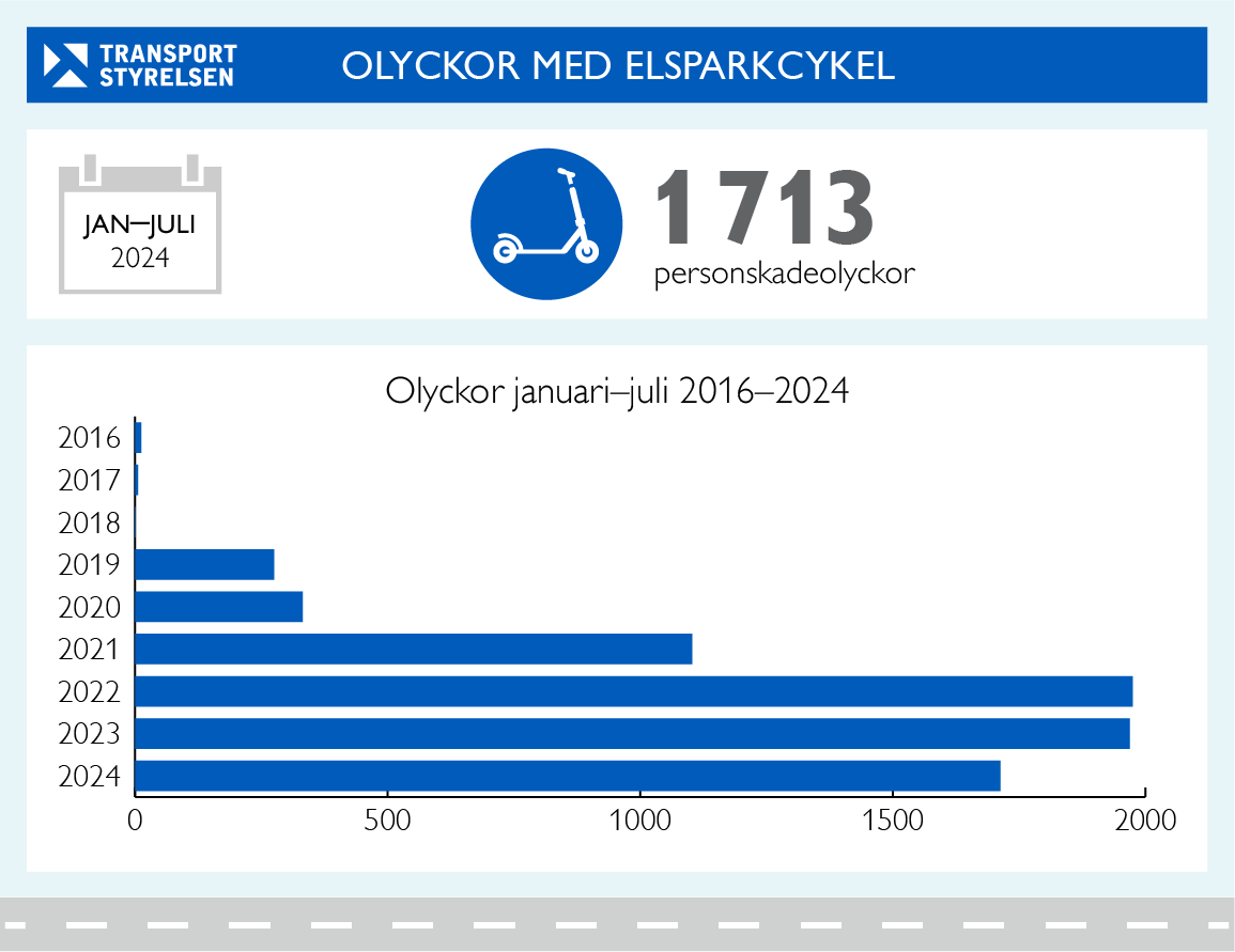 1 713 olyckor med minst en elsparkcykel inblandad under de första sju månaderna i år. Det är en minskning med 13 procent jämfört med samma period året innan. Fyra av dem var dödsolyckor jämfört med två 2023.