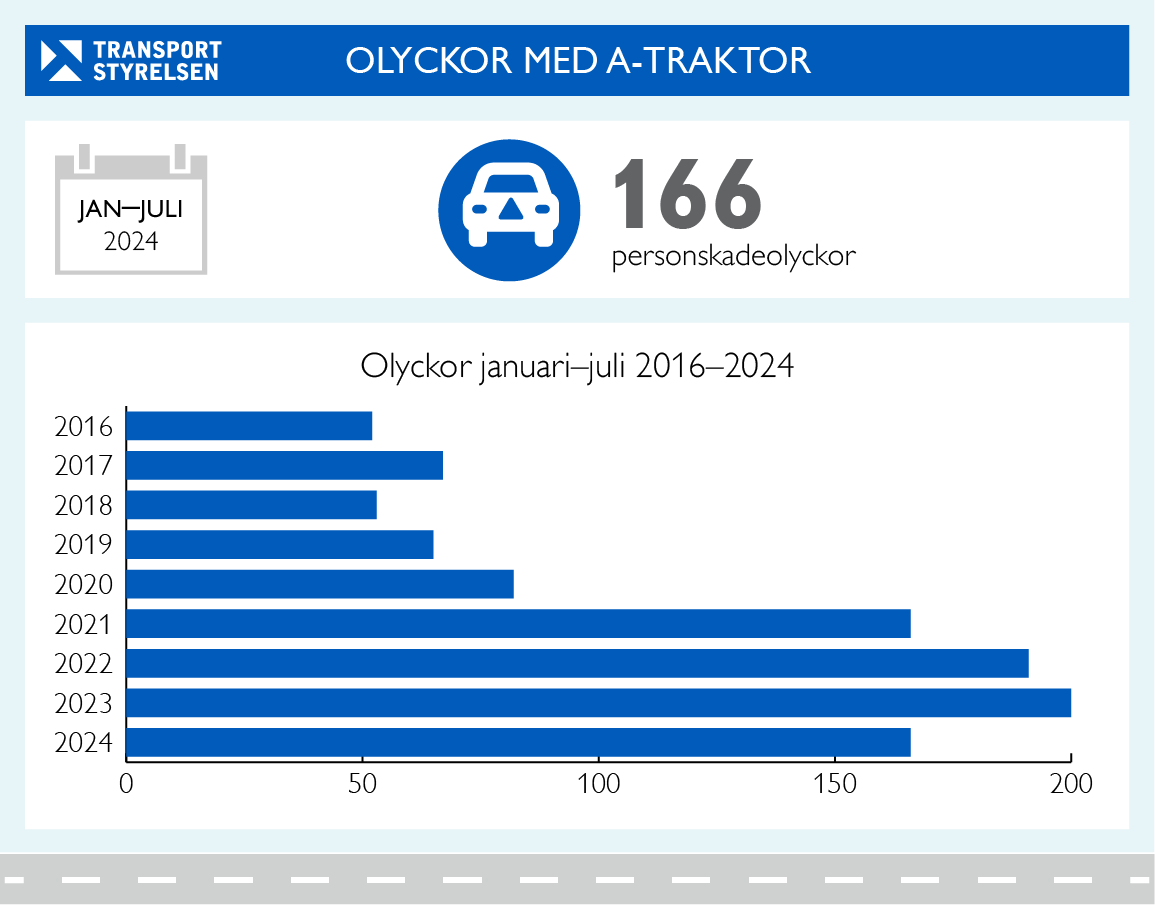 Under januari till och med juli 2024 inträffade 166 personskadeolyckor med A-traktor inblandad, 190 personer skadades i själva A-traktorerna. Majoriteten av de skadade har varit förare eller passagerare till A-traktorerna och tre av fyra är under 18 år.