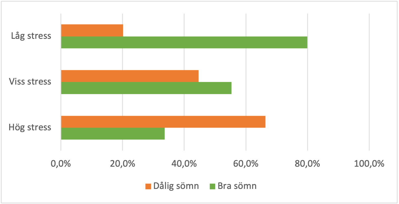 I en likadan korsanalys visar statistiken att den som har en stressnivå som innebär risker för ohälsa sover betydligt sämre. Av dem som anger en låg stressnivå är det en av fem som sover dåligt. Bland dem med hög stress sover två av tre dåligt.