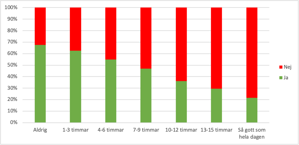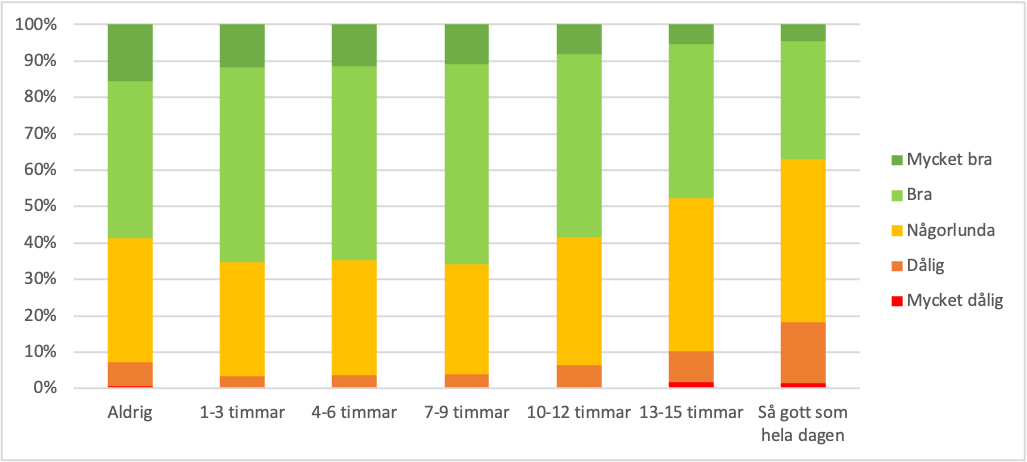 För medarbetare som är stillasittande upp till nio timmar per dag är det självskattade allmäntillståndet relativt likvärdigt. Men när stillasittandet är 10 timmar eller mer syns en trend där upplevelsen av allmänt hälsotillstånd försämras.