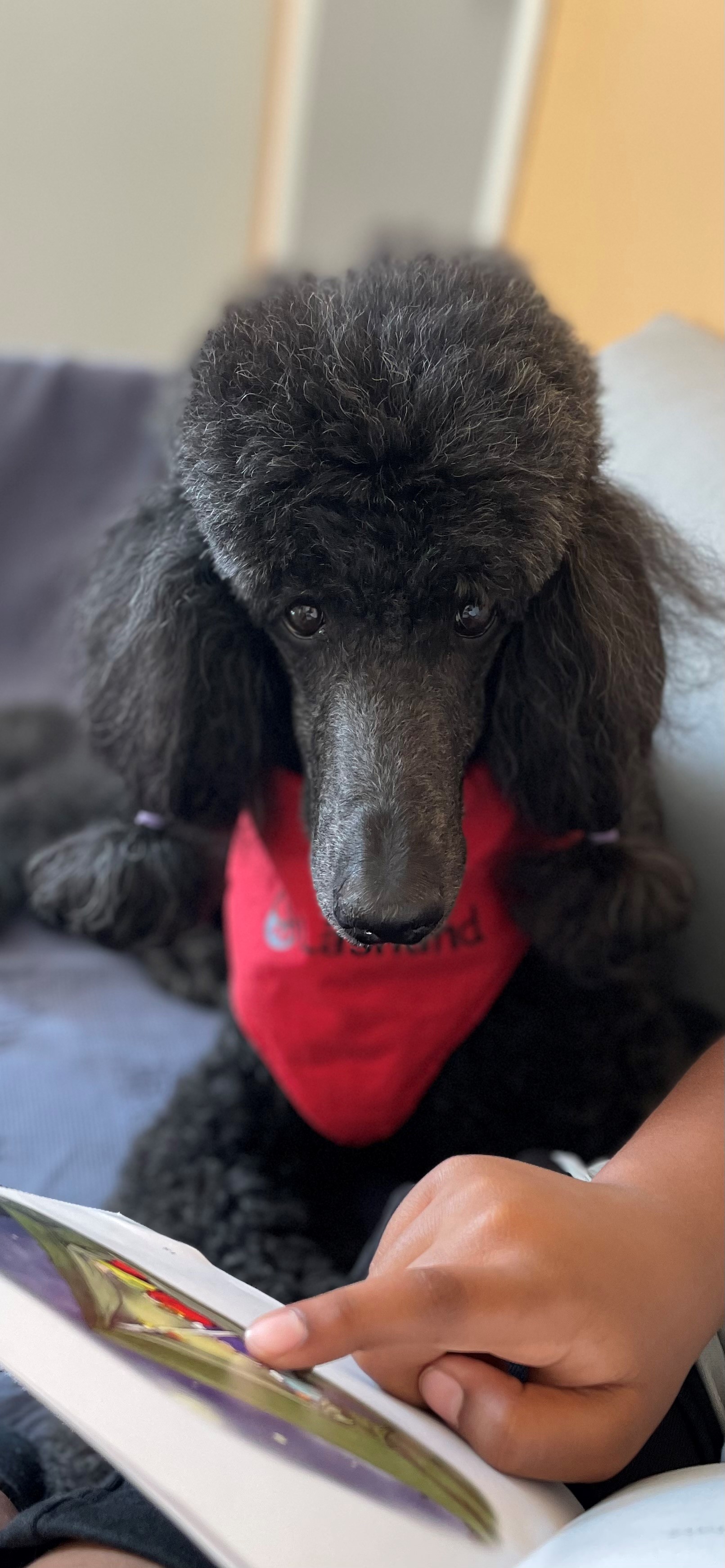 I Sigtuna kommun tränar storpudeln Zelda eleverna att läsa