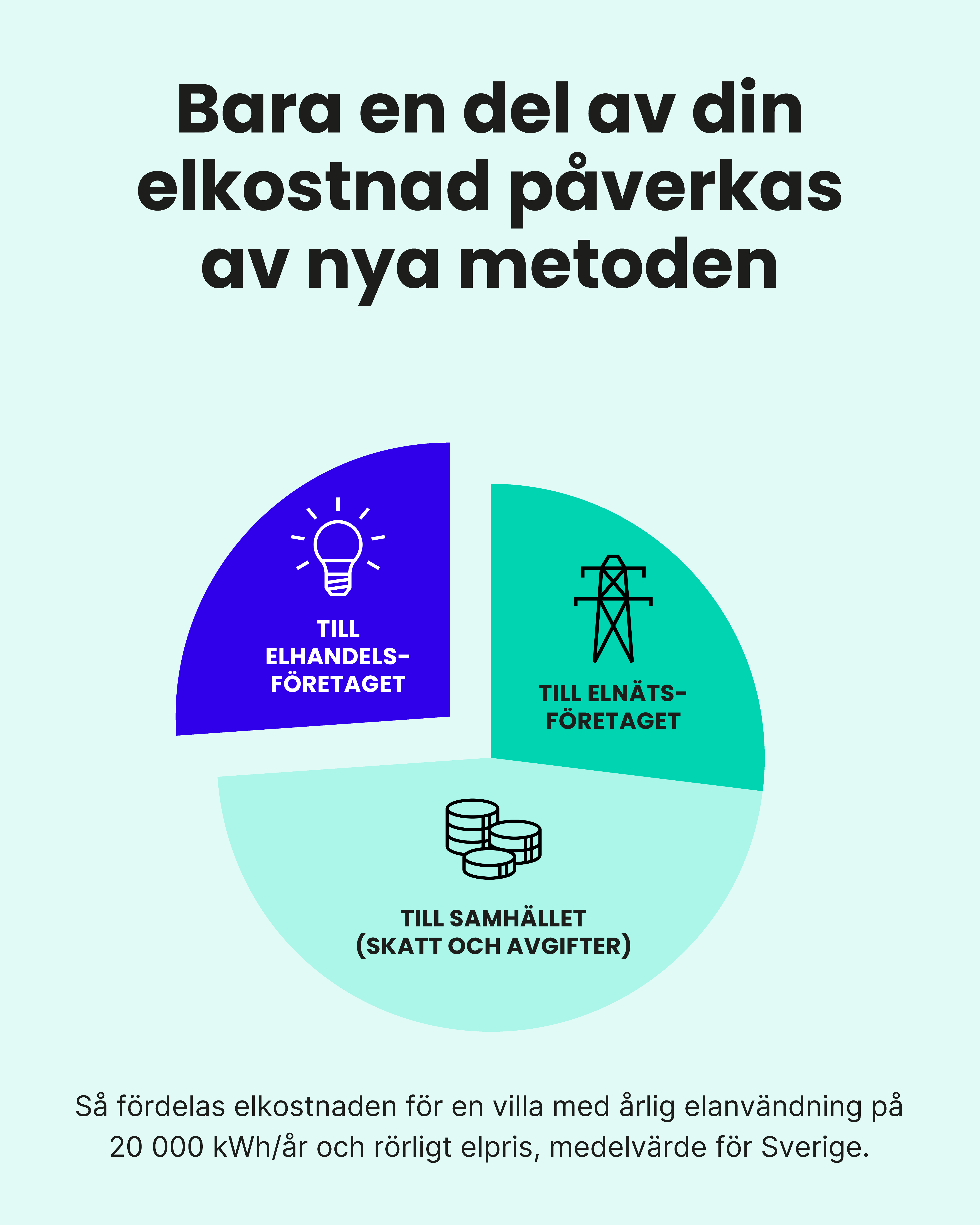 För hushållen utgör kostnaden för elhandel – det genomsnittliga elpriset – cirka en fjärdedel av den totala kostnaden för elförbrukningen. (Se bild) Knappt hälften består av skatter, moms och avgifter. Och det som är kvar, drygt en fjärdedel, är elnätskostnad. Det innebär att en förändring av elpriset med den nya flödesbaserade metoden påverkar endast elhandelsdelen. Så om elpriset blir 10 procent högre eller lägre med den nya metoden innebär det att effekten på den totala elkostnaden för hushållet blir cirka 2,5 procent.