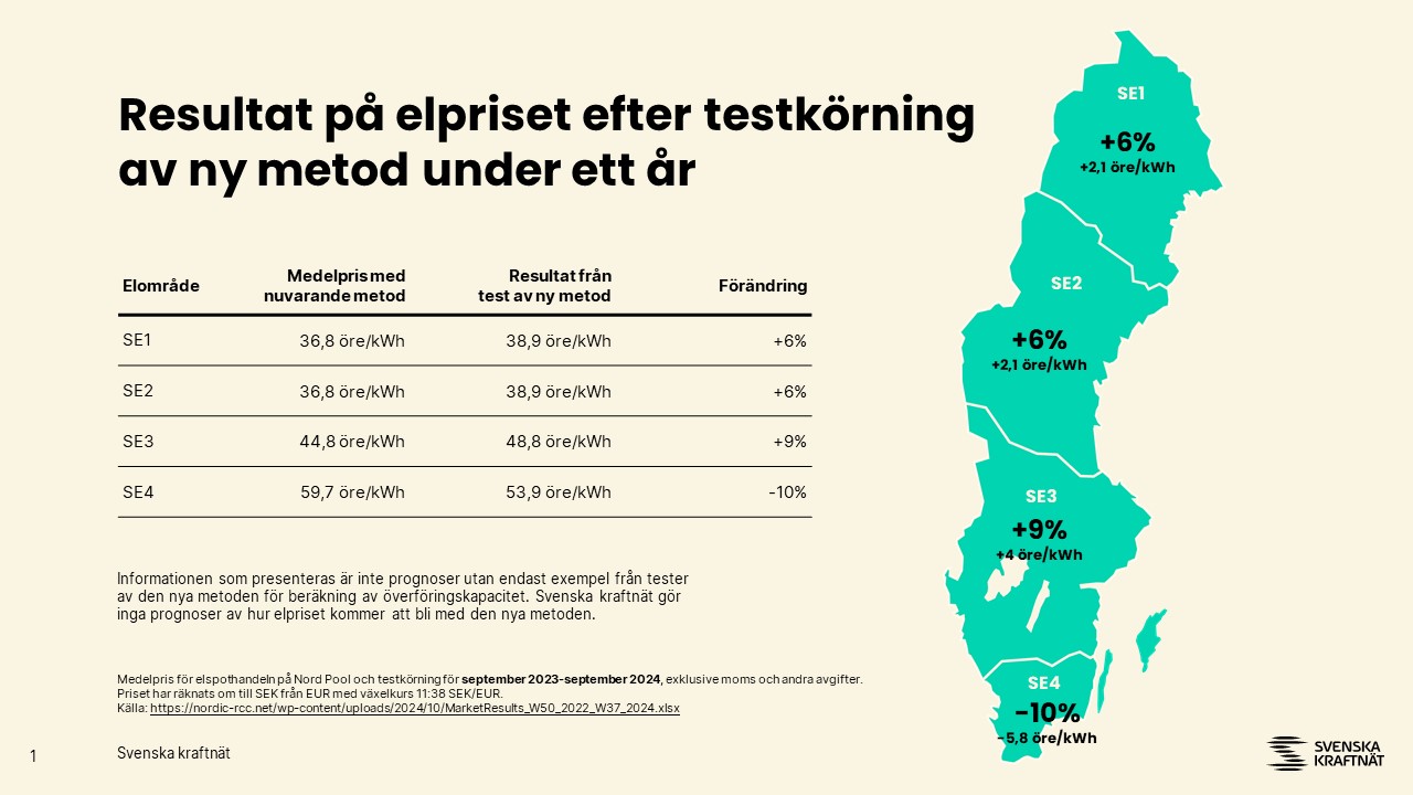 Sedan slutet av 2022 har Svenska kraftnät testkört den nya metoden för att bland annat undersöka effekten på elpriset. Resultaten visar att sett till en längre period, september 2023–september 2024, blev elpriset 6 procent högre i de två nordliga elområdena, 9 procent högre i det mellersta elområdet och 10 procent lägre i det södra elområdet. (Se bild)