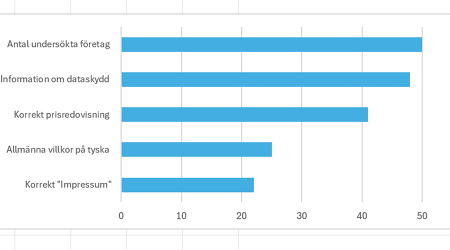Tysk-Svenska Handelskammarens analys omfattar 50 svenska företag med nätbutiker som erbjuder sina produkter på den tyska marknaden. En av de mest grundläggande bristerna gäller det så kallade "impressum", en juridisk information eller ansvarsförklaring om webbplatsens operatör. Över hälften av de granskade företagen saknade ett korrekt impressum. Vanligast var inkorrekta eller ofullständiga uppgifter.
