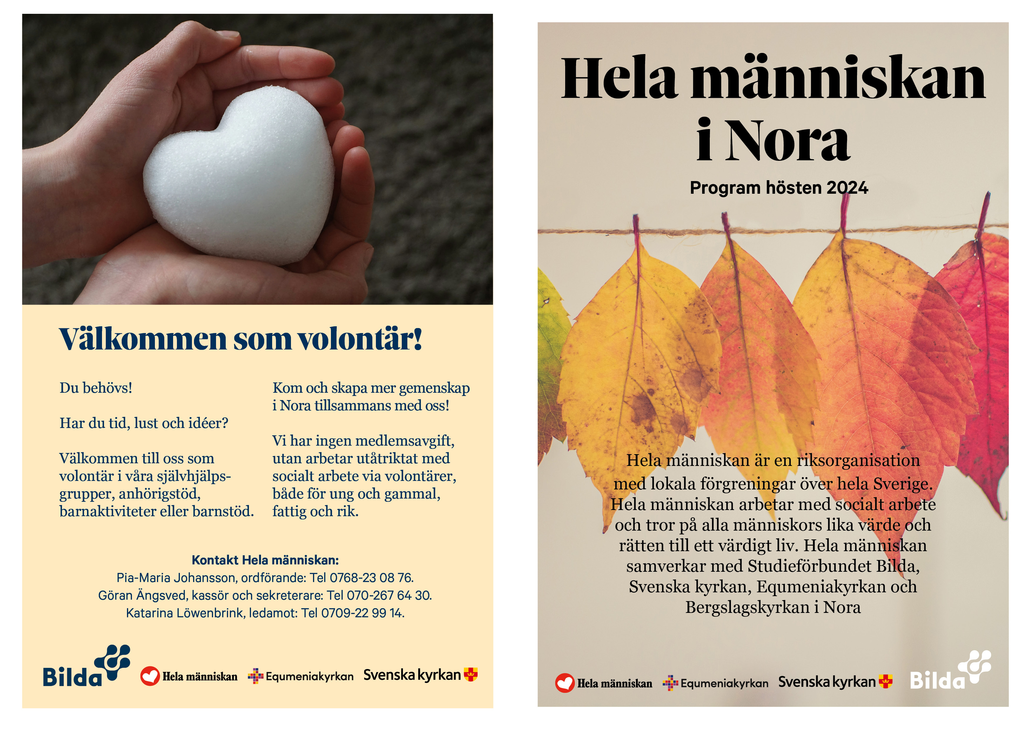 För mer information och kontakt: Pia-Maria Johansson, ordförande Hela människan i Nora: 0768-23 08 76