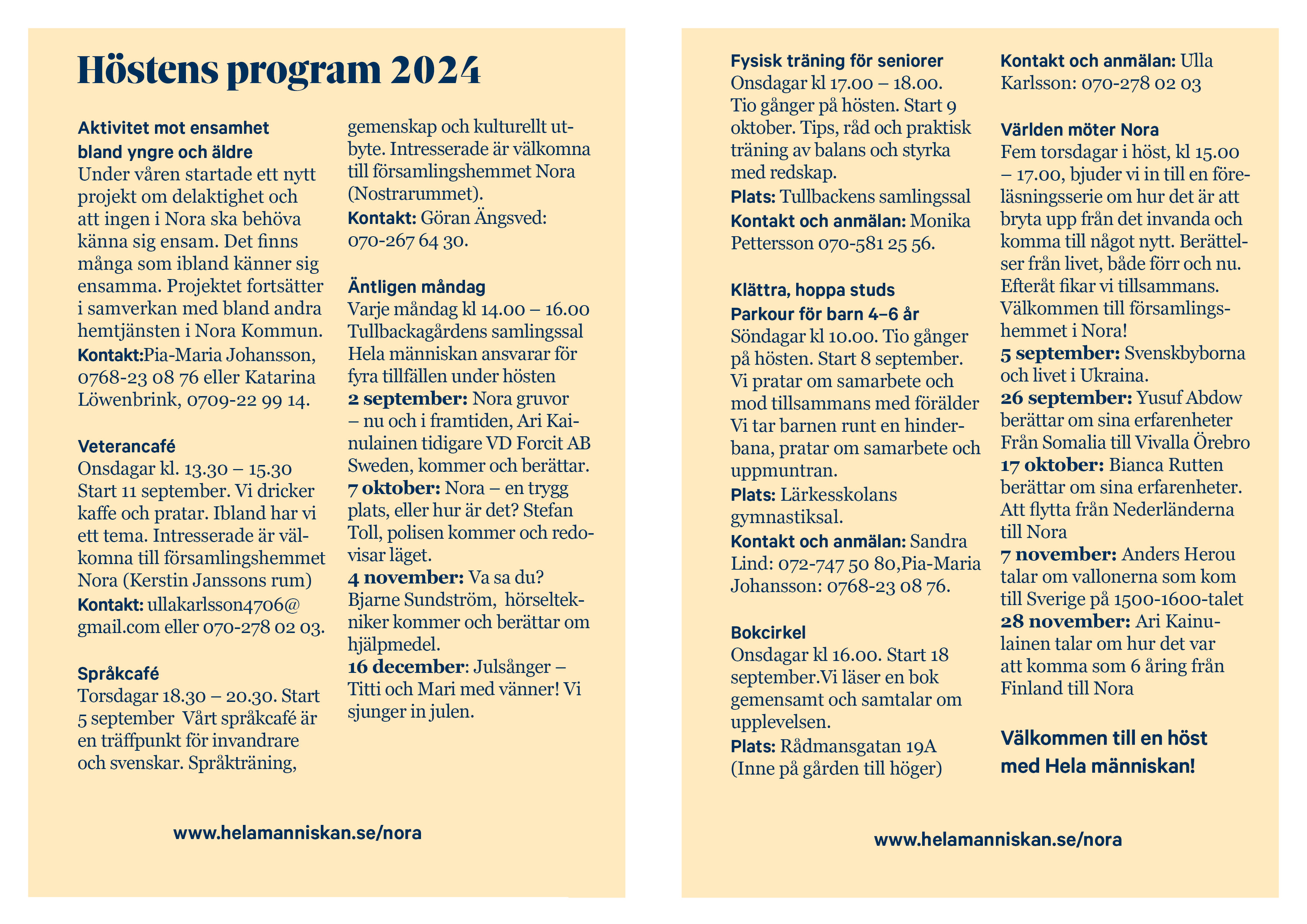 Under hösten anordnar Hela människan aktiviteter som språkcafé, veterancafé och föreläsningsserien "Världen möter Nora".