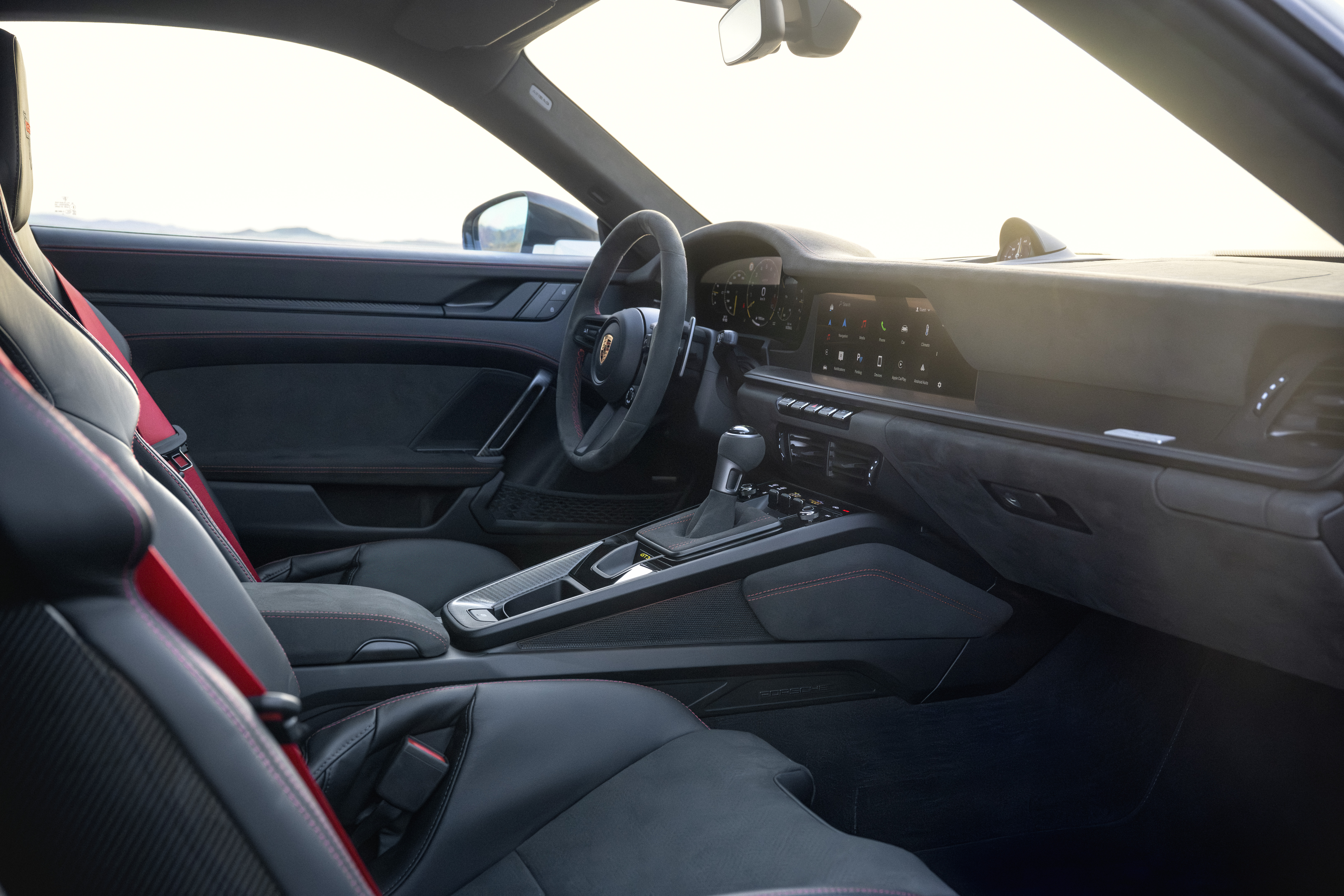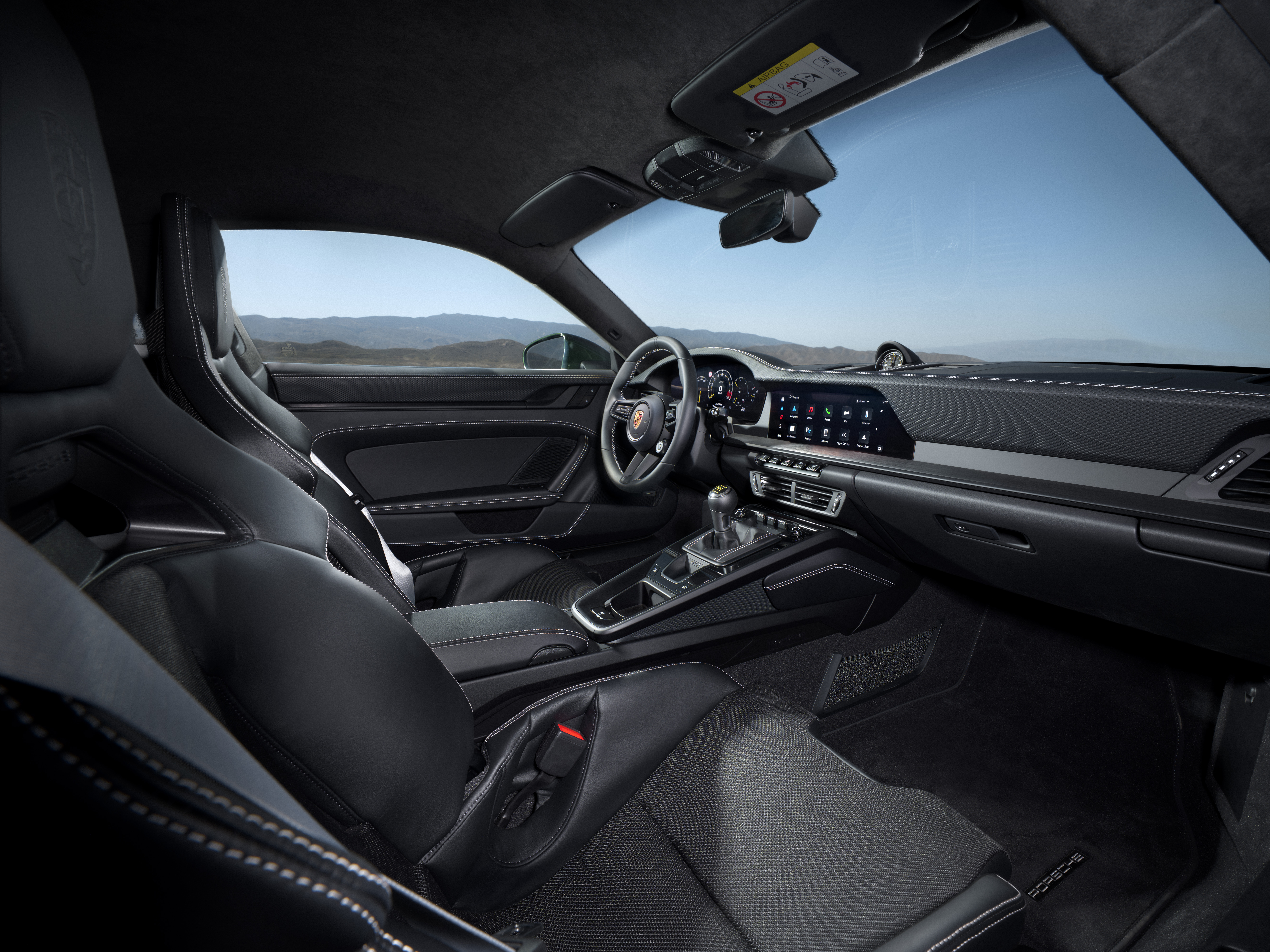 Den tvåsitsiga förarplatsen i nya 911 GT3 bygger på designen hos de aktuella 911-modellerna. Till skillnad från Carrera-modellerna startar dock inte 911 GT3 med en knapp, utan har fortsatt ett reglage för vridtändning. Som tillval erbjuds en burbåge som tydligt visar på modellens motorsportarv. Den digitala instrumentpanelen i mitten stöder föraren med ett tydligt strukturerat display- och manöverkoncept. Tack vare det kontrasterande färgschemat kan varvräknaren och stoppuret avläsas på nolltid. Visningsläget ”Track Screen” reducerar de digitala indikeringarna till vänster och höger om varvräknaren till nyckeldata om däck, olja, vatten och bränsle och informerar föraren om det optimala växlingsögonblicket med hjälp av en tydlig växlingsblinkning. Om så önskas kan varvräknarens display vridas så att varvtalsbegränsningen på 9 000 v/min ligger vid klockan 12-markeringen.