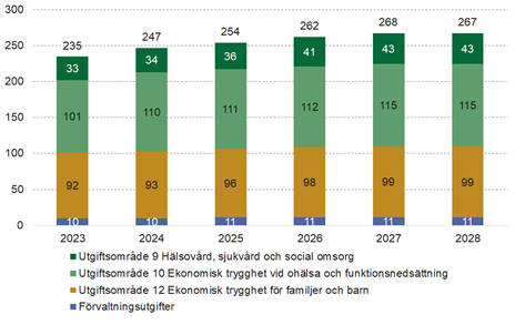 Totalt beräknas Försäkringskassans utgifter för socialförsäkringen bli 254 miljarder för år 2025, vilket motsvarar 18 procent av de 1 402 miljarder som utgör statens totala budgeterade utgifter för året. År 2023 stod socialförsäkringen för 19,4 procent av statens utgifter.