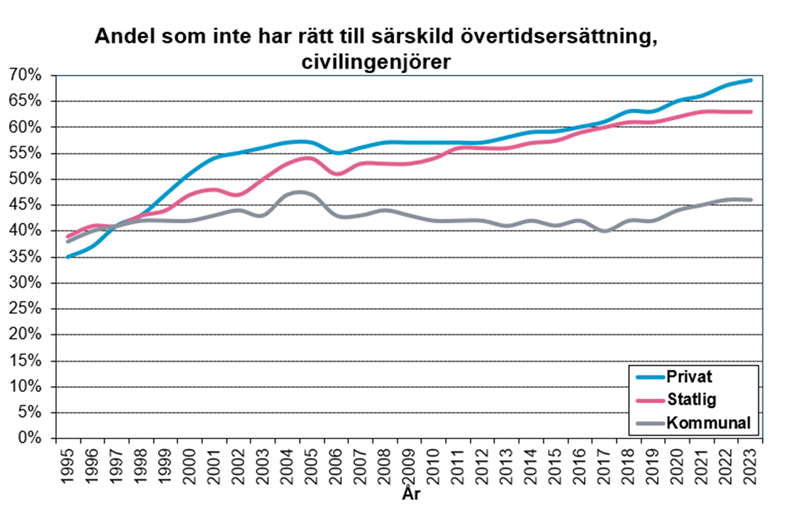 Många akademiker och tjänstemän har förhandlat bort sin övertidsersättning. En ny rapport, ”Tid är pengar – rekommendationer till övertidsavlösta ingenjörer”, uppskattar att det finns nästan 150 000 övertidsavlösta ingenjörer på svensk arbetsmarknad. Utifrån Akavias lönestatistik finns det uppskattningsvis lika många jurister och ekonomer med bortförhandlad övertidsersättning.