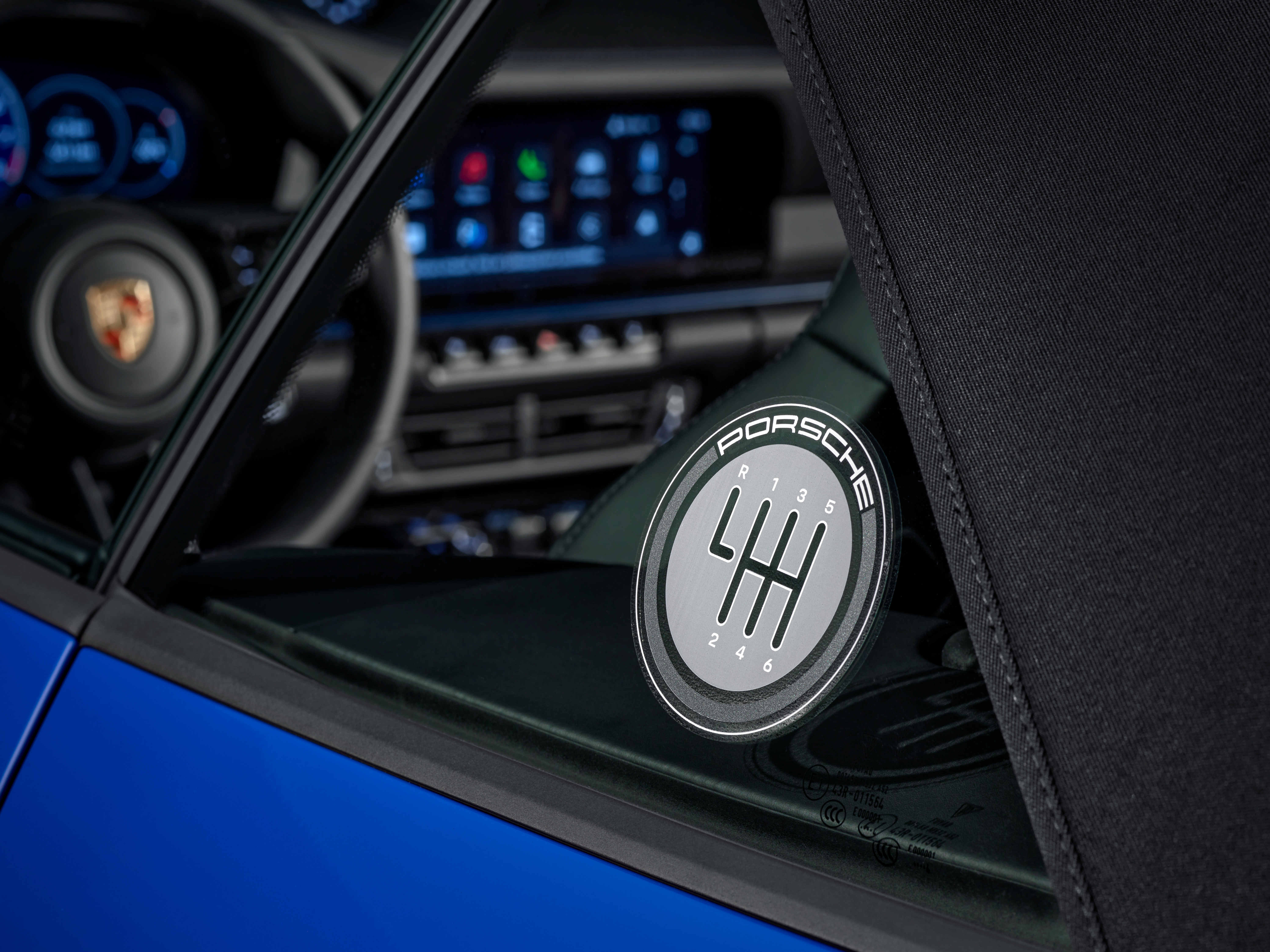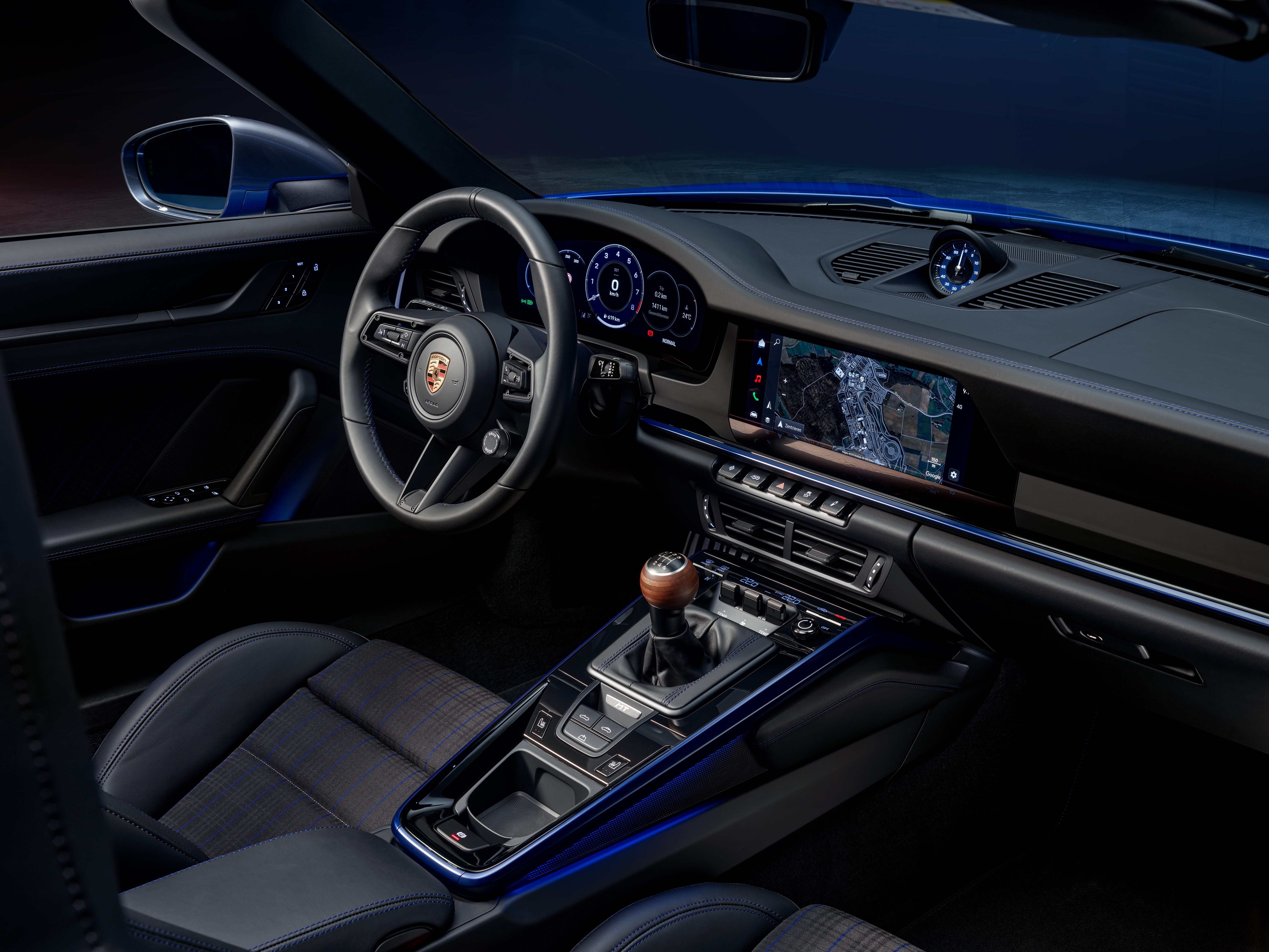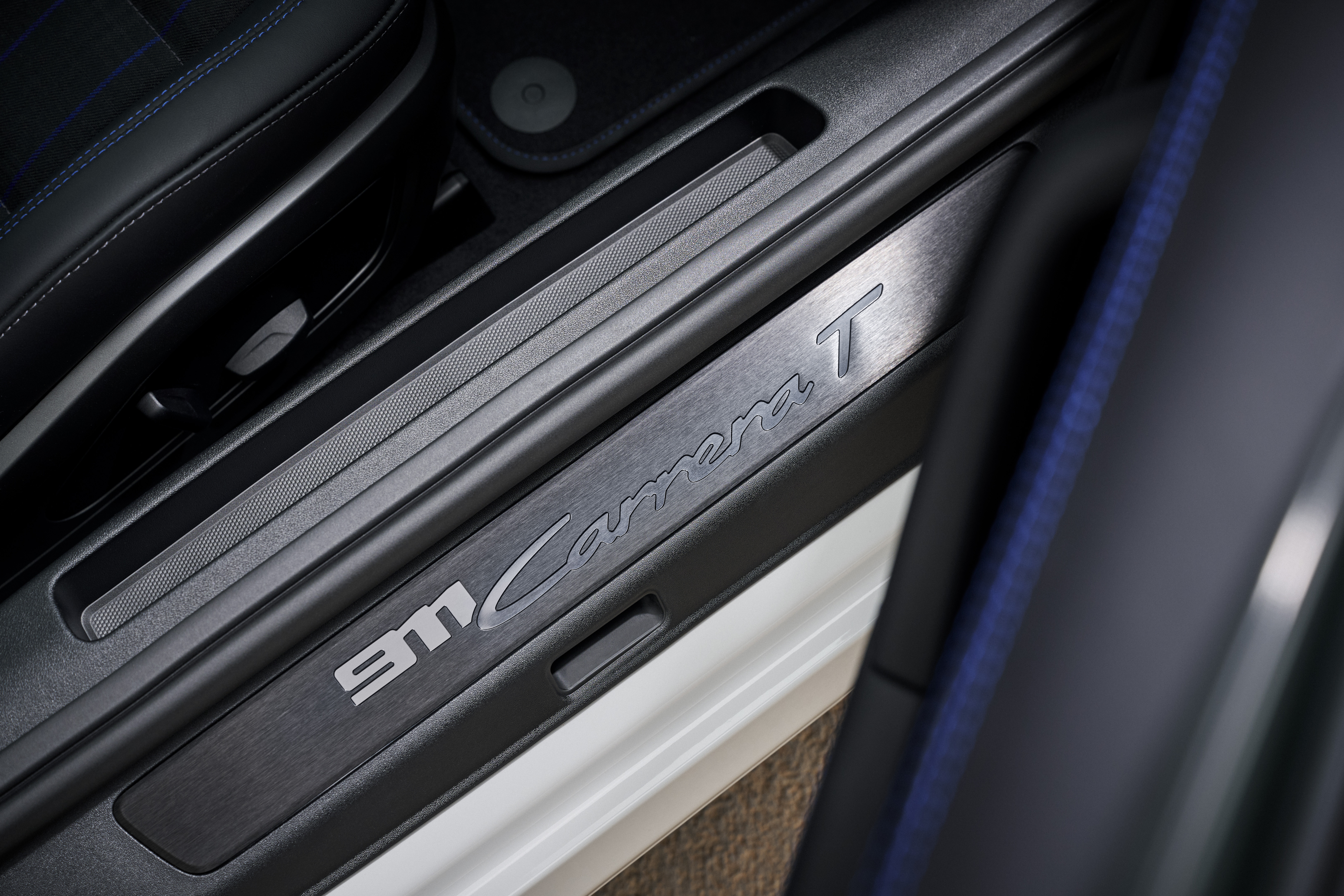 Sportig och svart, med kontrasterande sömmar som tillval, har Porsche gett interiören i Carrera T ett tydligt puristiskt utseende som är typiskt för T-modellen. Det iögonfallande stoppuret i grundutförandets Sport Chrono-paket är framträdande på instrumentpanelen. Flera speciella detaljer understryker den exklusiva karaktären hos 911 Carrera T som manuell sportbil: Den förkortade växelspaken pryds av en växelspaksknopp i öppenporigt valnötsträ, vilket ger en speciell upplevelse både visuellt och haptiskt. Framför växelspaken finns ett emblem med ”MT”-logotypen för manuell växellåda. Växlingsmönsterlogotypen är tryckt på passagerarsidan av instrumentpanelen. Till grundutrustningen hör även den läderklädda och uppvärmbara GT-sportratten med lägesväljare. Som alternativ finns även en ratt klädd i Race-Tex. Dekorinläggen på instrumentpanelen och mittkonsolen är i Vanadium Grey och dörrpanelerna i svart borstad aluminium.