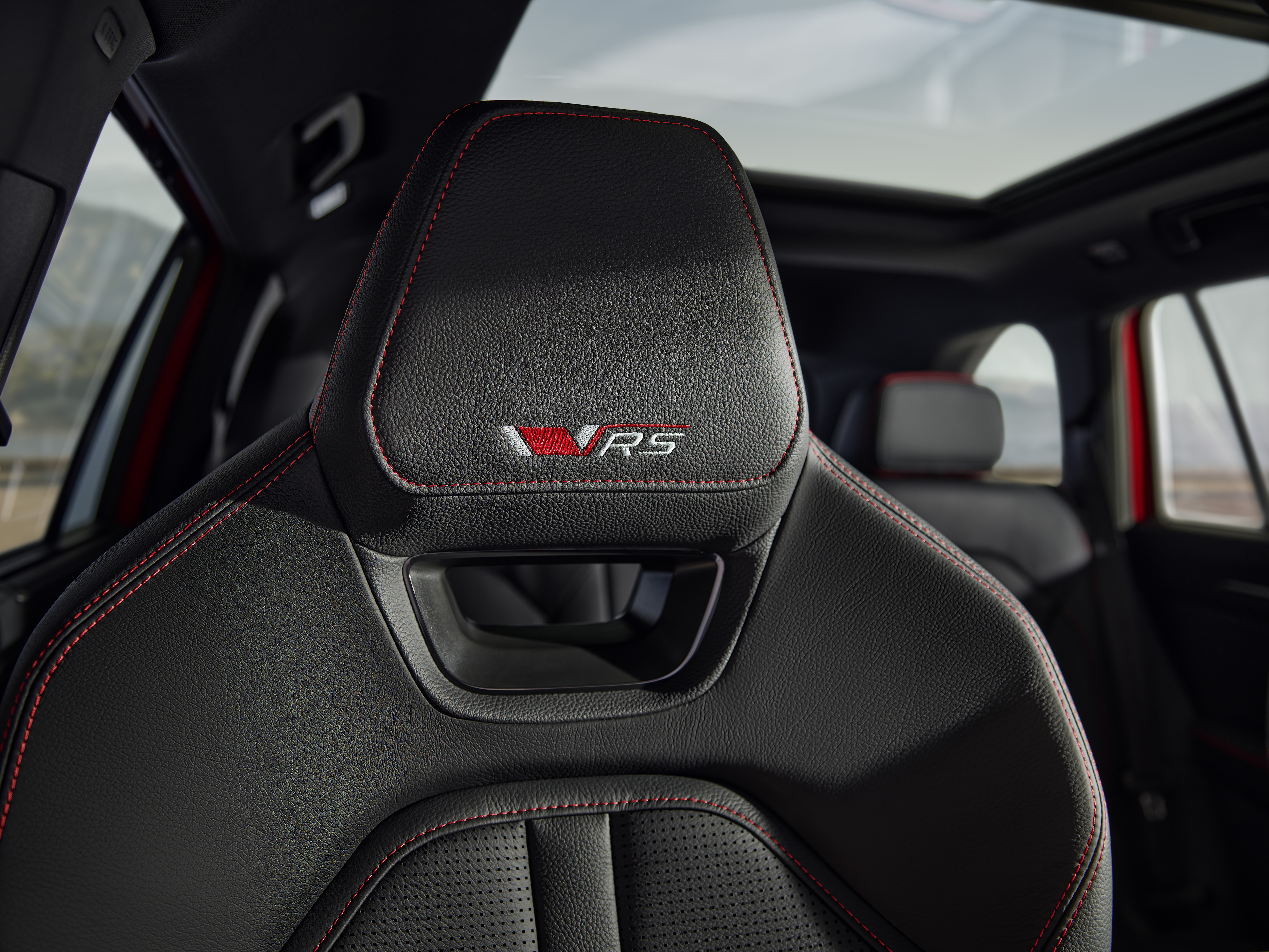 Interiörmässigt kan kunder välja mellan två olika designalternativ för sin Kodiaq RS. I instegsmodellen - RS Lounge Design - ingår sportstolar med integrerade nackstöd och svart klädsel i Suedia/konstläder med röda kontrastsömmar. Båda framstolarna är elektriskt justerbara som standard och har minnesfunktion. Liksom det mesta av interiören är innertaket lackerat i sportigt svart. Designdelen av instrumentbrädan, dörrinläggen och mittarmstödet är klädda med svart Suedia.