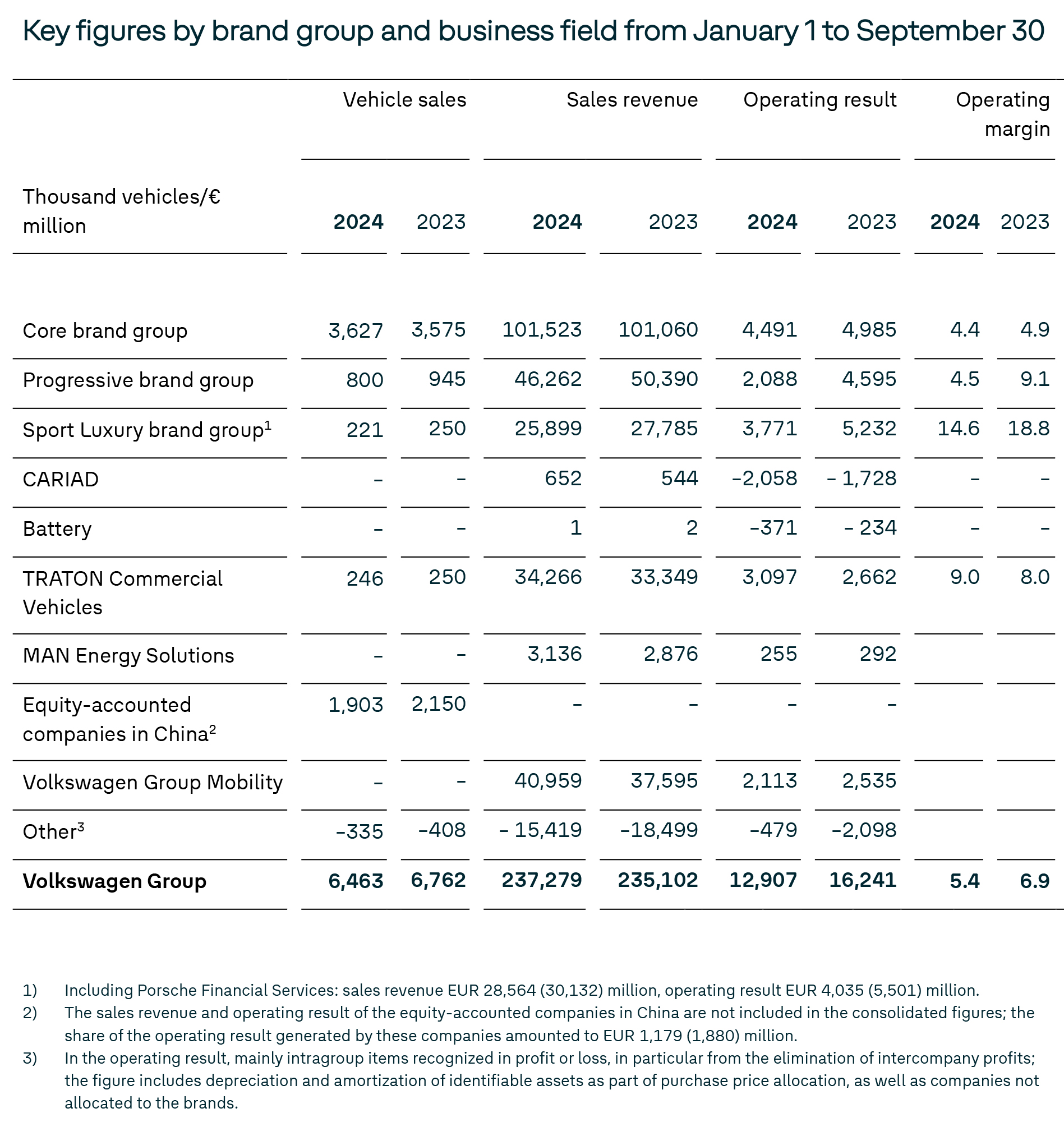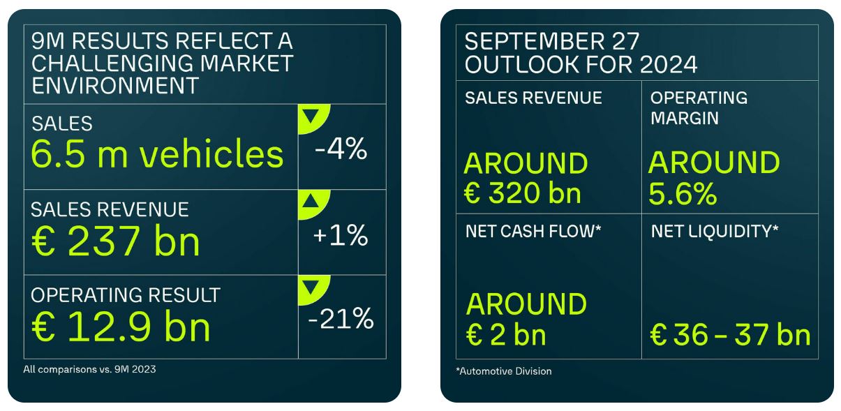 Rörelseresultatet uppgick till 12,9 miljarder euro under årets första nio månader 2024, vilket är 21 % lägre än samma period 2023 (16,2 miljarder euro); Rörelsemarginalen uppgick till 5,4 procent
